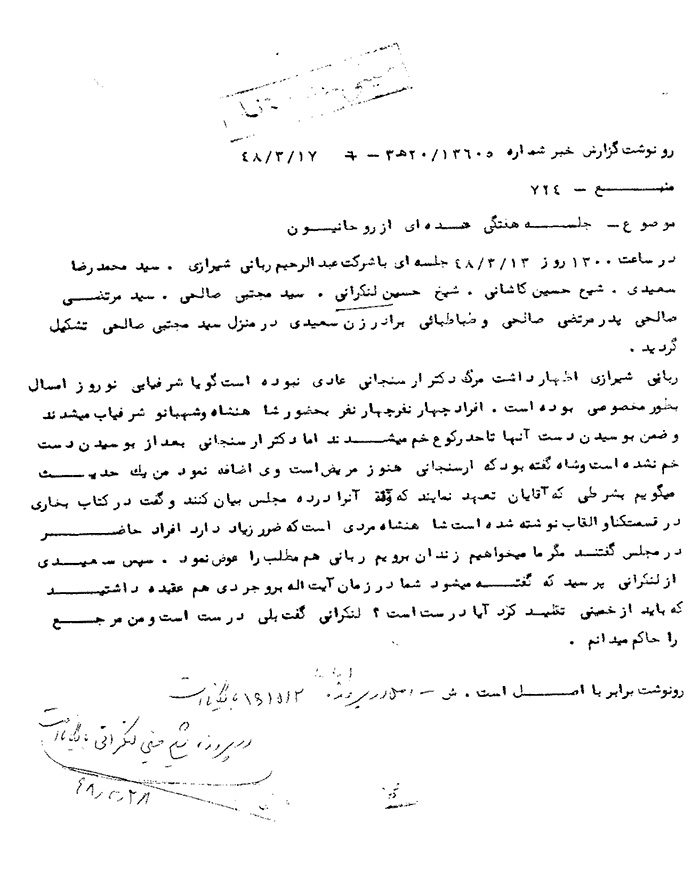 در پرونده شیخ حسین لنکرانى بایگانى است. 28 / 3 / 48