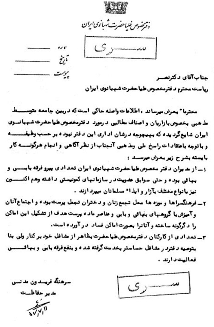 3ـ تعدادی از کارکنان دفتر مخصوص علیاحضرت به ظاهر از مشاغل خود برکنار ولی بنا به توصیه دفتر در مشاغل حساستر به خدمت گرفته شده و به نفع فرقه بابی و بهائی فعالیت دارند.[1]