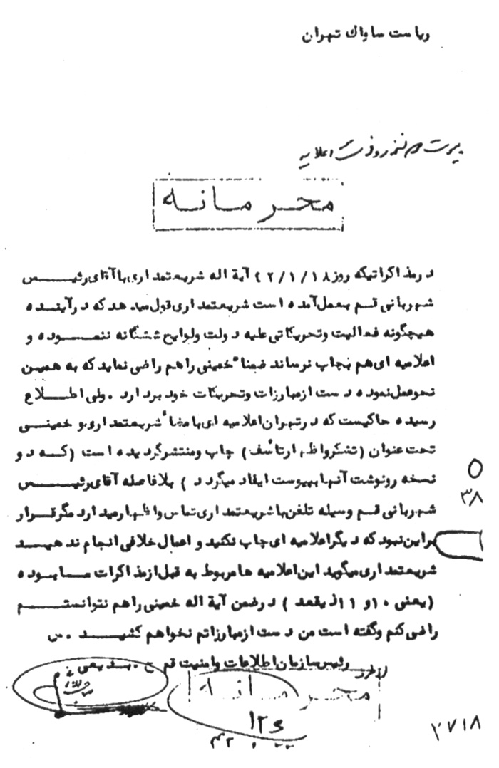 در مذاکراتی که روز 18 / 1 / 42 آیهاله شریعتمدارى با آقاى رئیس شهربانى قم به عمل آمده است شریعتمدارى قول میدهد که در آینده هیچگونه فعالیت و تحریکاتى علیه دولت و لوایح ششگانه ننموده و اعلامیهاى هم به چاپ نرساند، ضمناً خمینى را هم راضى نماید که به همین نحو عمل نموده دست از مبارزات و تحریکات خود بردارد. ولى اطلاع رسیده حاکیست که در تهران اعلامیهاى به امضاء شریعتمدارى و خمینى تحت عنوان (تشکر و اظهار تأسف) چاپ و منتشر گردیده است (که دو نسخه رونوشت آنها به پیوست ایفاد میگردد) بلافاصله آقاى رئیس شهربانى قم وسیله تلفن با شریعتمدارى تماس و اظهار میدارد مگر قرار بر این نبود که دیگر اعلامیهاى چاپ نکنید و اعمال خلافى انجام ندهید؟