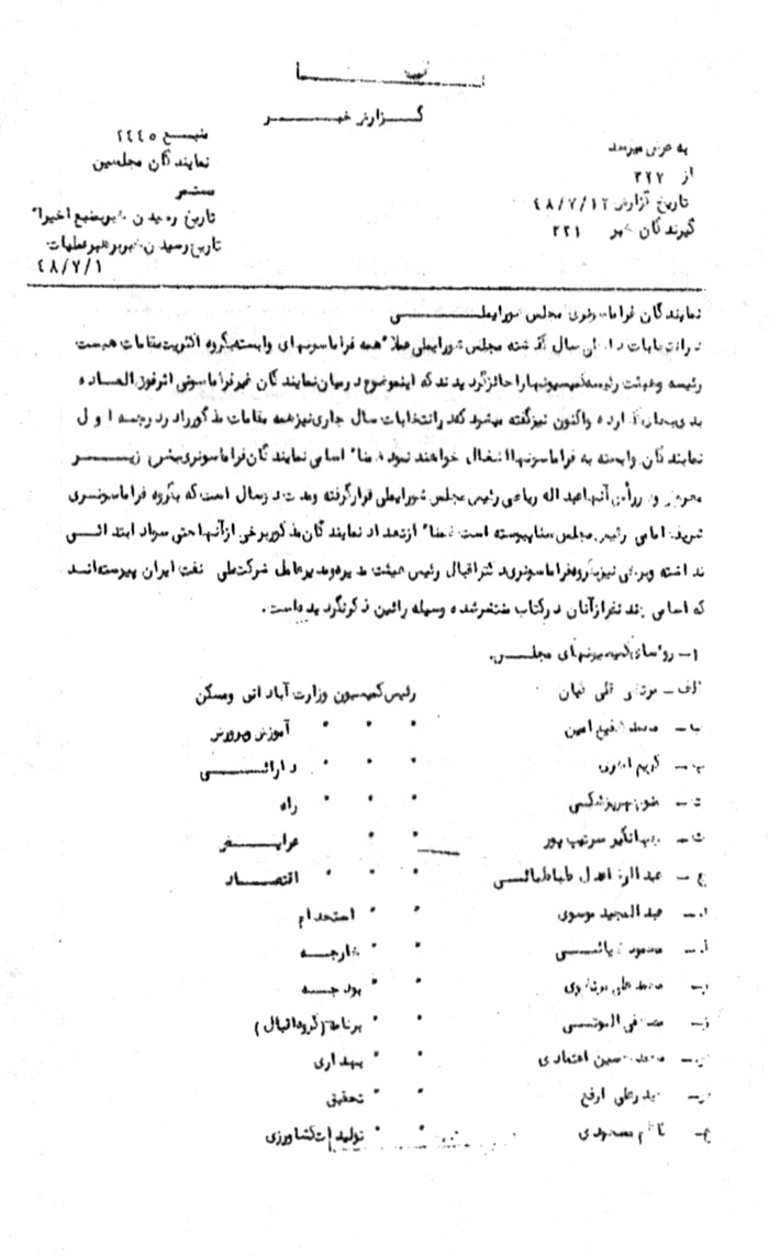 در انتخابات داخلى سال گذشته مجلس شوراى ملى عملاً همه فراماسونرهاى وابسته به گروه اکثریت مقامات هیئت رئیسه و هیئت رئیسه کمیسیونها را حائز گردیدند که این موضوع در میان نمایندگان غیر فراماسونرى اثر فوقالعاده بدى به جاى گذارده و اکنون نیز گفته مىشود که در انتخابات سال جارى نیز همه مقامات مذکور را در درجه اول نمایندگان وابسته به فراماسونها اشغال خواهند نمود. ضمناً اسامى نمایندگان فراماسونرى به شرح زیر معروض و در رأس آنها عبداله ریاضى رئیس مجلس شوراى ملى قرار گرفته و مدت دو سال است که به گروه فراماسونرى شریف امامى رئیس مجلس سنا پیوسته است. ضمناً از تعداد نمایندگان مذکور برخى از آنها حتى سواد ابتدائى نداشته و برخى نیز به گروه فراماسونرى دکتر اقبال رئیس هیئت مدیره و مدیرعامل شرکت ملى نفت ایران پیوستهاند که اسامى چند نفر از آنان در کتاب منتشر شده وسیله رائین ذکر نگردیده است.