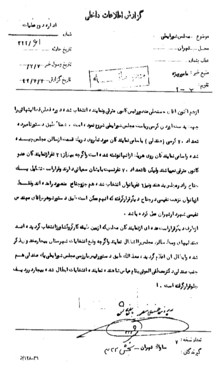از هم اکنون آقاى حسنعلى منصور رئیس کانون مترقى و نماینده انتخاب شده دوره فعلى فعالیتهائى را جهت به دست آوردن کرسى ریاست مجلس شوراى ملى شروع نموده است. ضمناً طبق دستور نامبرده تعداد 70 کرسى(صندلى) به اسامى نمایندگان مورد نظر وى در یک قسمت از سالن مجلس چیده شده و اسامى نمایندگان روى هر یک از آنها نوشته شده است و اگر چه بیش از 39 نفر از نمایندگان عضو کانون مترقى نمىباشند و لیکن تا تعداد 70 نفر نسبت به ایشان سمپاتى دارند و قرار است تشکیل یک جناح را در مجلس بدهند و نیز 6 نفر بانوان انتخاب شده هم جزو جناح منصور در آمدهاند و فقط از بانوان نزهت نفیسى[1] در جناح دیگر قرار گرفته که آن هم ممکن است طبق دستور شوهرش آقاى مهندس نفیسى[2] شهردار تهران عمل کرده باشد.