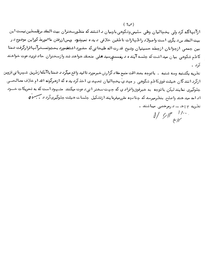 توضیح شنبه- پس از ختم جلسه یکی از مامورین اطلاعات شهربانی قزوین که در جلسه حضور داشت به علی سلیمی و مهدی یخچالیان و شکوهی مراجعه و نسبت به سخنرانی دو نفر فوقالذکر در جلسه معترض و در این مورد از آنها گله کرد ولی یخچالیان و علی سلیمی و شکوهی به او بیان داشتند که منظور سخنران بیت المقدس فلسطین نیست این بیت المقدس دیگری است و اصولاً در اظهارات ناطقین خلافی دیده نمیشود و پس از رفتن مامور مذکور این موضوع در بین جمعی از جوانان از جمله حسینیان و شیخ قدرتاله علیخانی که حضور داشتند مورد بحث و تمسخر آنها قرار گرفت. ضمناً کاظم شکوهی بیان میداشت که جلسه آینده در مسجد سید علی منعقد خواهد شد و از سخنران حادتری دعوت خواهند کرد.