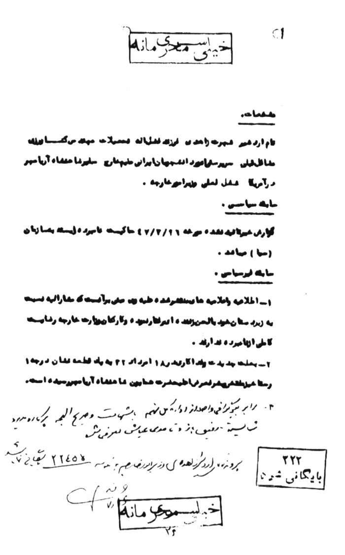 [در] پرونده آقای اردشیر زاهدی وزیر امور خارجه به کلاسه 22455 بایگانی نمائید. 16 / 7