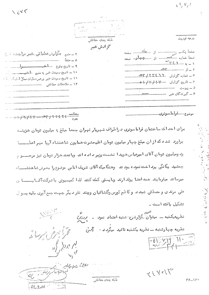 براى احداث ساختمان فراماسونرى در اطراف شهریار تهران جمعا مبلغ 9 میلیون تومان هزینه برآورد شده که از آن مبلغ چهار میلیون تومان اعلیحضرت همایون شاهنشاه آریامهر اعطا و دو میلیون تومان آقاى امیرعباس هویدا نخست وزیر دادهاند و پانصد هزار تومان نیز مرحوم جمشید یگانگى پرداخت نموده بودند و هنگامى که آقاى شریفامامى موضوع را به عرض شاهنشاه مىرساند، مىفرمایند: همه اعضا پولدارند و بایستى کمک کنند. لذا کمیسیونى با شرکت آقایان على مرندى و مصطفى تجدد و کاظم کورس و گلشائیان و چند نفر دیگر جهت جمعآورى بقیه پول تشکیل یافته است.