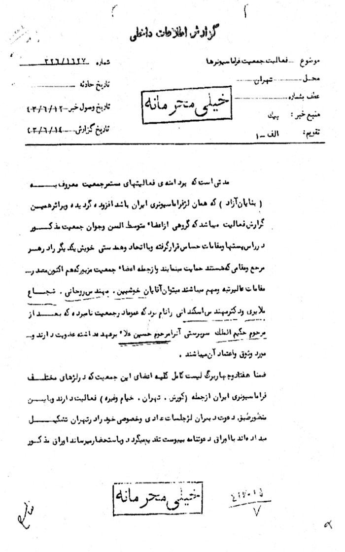 مدتی است که بر دامنهی فعالیتهای مستمر جمعیت معروف به (بنایان آزاد[1]) که همان لژ فراماسیونری ایران باشد افزوده گردیده و بر اثر همین گزارش فعالیت میباشد که گروهی از اعضاء متوسطالسن و جوان جمعیت مذکور در رأس پستها و مقامات حساس قرار گرفته و با اتحاد و همدستی خویش یکدیگر را در هر مرجع و مقامی که هستند حمایت مینمایند و از جمله اعضاء جمعیت مزبور که هم اکنون مصدر مقامات عالیرتبه و مهم میباشند میتوان آقایان خوشبین،[2] مهندس روحانی[3]، شجاعملایری[4] و دکتر مهندساسکندرانی را نام برد کهعموماً در جمعیت نامبرده که بعد از مرحوم حکیمالملک[5] سرپرستی آن را مرحوم حسین علاء[6] برعهده داشته عضویت دارند و مورد وثوق و اعتماد آن میباشند. ضمناً هفتاد و چهار برگ لیست کامل کلیه اعضای این جمعیت که در لژهای مختلف فراماسیونری ایران ازجمله (کورش، تهران، خیام و غیره) فعالیت دارند و به این منظور طبق دعوت دبیران لژ جلسات عادی و خصوصی خود را در تهران تشکیل میدادهاند، با اوراق دعوتنامه به پیوست تقدیم میگردد و به استحضار میرساند اوراق مذکور مربوط به جلساتی است که در ظرف 10 ماه گذشته (از اول مهر ماه 42 الی 27 خرداد ماه43) در تهران تشکیل گردیده و از آن پس به علت فرا رسیدن فصل گرما طبقمعمول تعطیل گردیده و تا آخر ماه جاری نیز تعطیل خواهد بود.