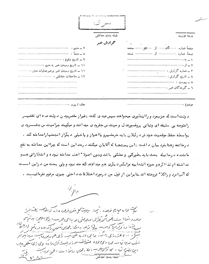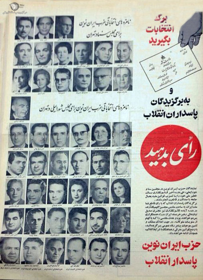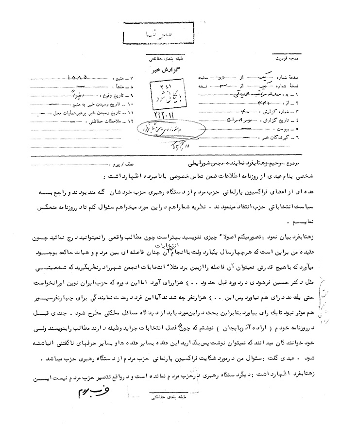 ریاست اداره چهارم فرمودند، تیمسار مدیریت کل مقرر فرمودهاند که مطالب زهتابفرد در مورد انتخابات انجمن شهر تهران در بولتن نوبهاى حزب ایران نوین به ترتیبى مورد استفاده قرار گیرد که حزب بدون توجه به افکار عمومى، شخصى را که در دوره قبل (فرهودى) بیش از 400 هزار رأى داشته در این دوره حتى یک رأى هم نیاورده است. در حالى که اگر منظور عدم انتخاب مجدد وی بوده میتوانستند او را در لیست قرار داده ولى رأى مکفی نیاورد. این موضوع نشانهى بىتوجهى حزب به افکار عمومى در انتخابات انجمنها بوده است. موفقى 10 / 8 / 51
