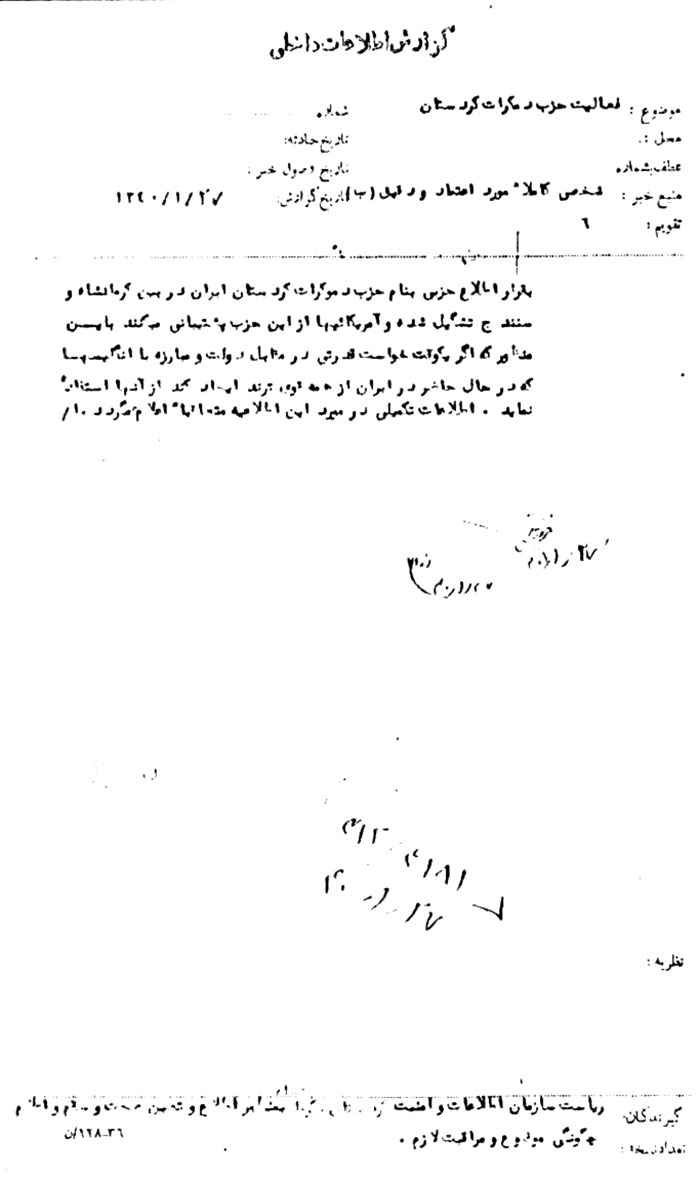 به قرار اطلاع حزبى به نام حزب دموکرات کردستان ایران در بین کرمانشاه - سنندج تشکیل شده و آمریکائیها از این حزب پشتیبانى میکنند به این منظور که اگر یک وقت خواست قدرتى در مقابل دولت و مبارزه با انگلیسها که در حال حاضر در ایران از همه قوىترند ایجاد کند از آنها استفاده نماید. اطلاعات تکمیلى در مورد این اطلاعیه متعاقباً اعلام میگردد.