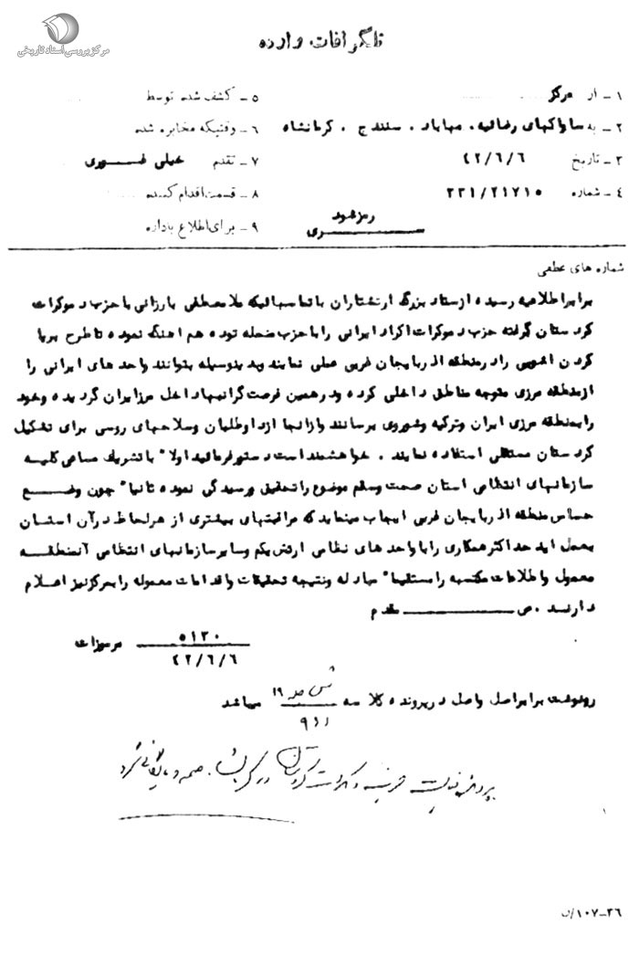 برابر اطلاعیه رسیده از ستاد بزرگ ارتشتاران با تماسهائیکه ملامصطفى بارزانى با حزب دموکرات کردستان گرفته حزب دموکرات اکراد ایرانى را با حزب منحله توده همآهنگ نموده تا طرح برپا کردن آشوبى را در منطقه آذربایجان غربى عملى نمایند و بدینوسیله بتوانند واحدهاى ایرانى را از منطقه مرزى متوجه مناطق داخلى کرده و در همین فرصت گرانبها داخل مرز ایران گردیده و خود را به منطقه مرزى ایران و ترکیه و شوروى برسانند و از آنجا از داوطلبان و سلاحهاى روسى براى تشکیل کردستان مستقلى استفاده نمایند. خواهشمند است دستور فرمائید اولاً با تشریک مساعى کلیه سازمانهاى انتظامى استان صحت و سقم موضوع را تحقیق و رسیدگى نموده، ثانیاً چون وضع حساس منطقه آذربایجان غربى ایجاب مینماید که مراقبتهاى بیشترى از هر لحاظ در آن استان به عمل آید حداکثر همکارى را با واحدهاى نظامى ارتش یکم و سایر سازمانهاى انتظامى آن منطقه معمول و اطلاعات مکتسبه را مستقیماً مبادله و نتیجه تحقیقات و اقدامات معموله را به مرکز نیز اعلام دارند. ص