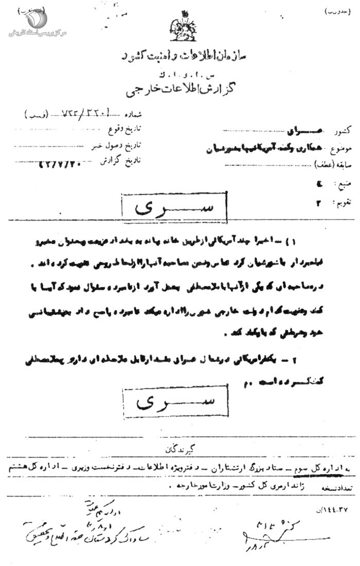 گیرندگان: اداره سوم- ستاد بزرگ ارتشتاران - دفتر ویژه اطلاعات – دفتر نخستوزیرى - اداره کل هشتم - ژاندارمرى کل کشور - وزارت امورخارجه