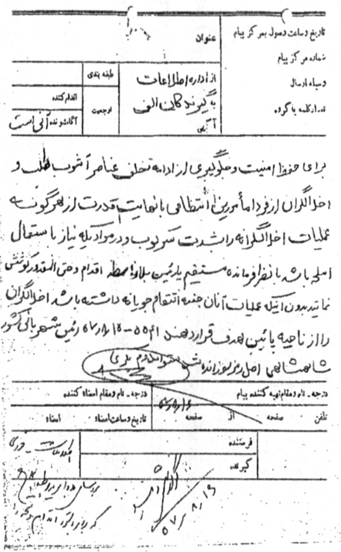 براى حفظ امنیت و جلوگیرى از ادامه تخلف عناصر آشوبطلب و اخلالگران از فردا مأمورین انتظامى با نهایت قدرت از هرگونه عملیات اخلالگرانه را به شدت سرکوب و در مواردی که نیاز به استعمال اسلحه باشد با نظر فرمانده مستقیم یا رئیس بلاواسطه اقدام و حتىالمقدور کوشش نمایند بدون اینکه عملیات آنان جنبه انتقامجویانه داشته باشد اخلالگران را از ناحیه پائین هدف قرار دهند. 5541 ـ 15 / 8 / 57