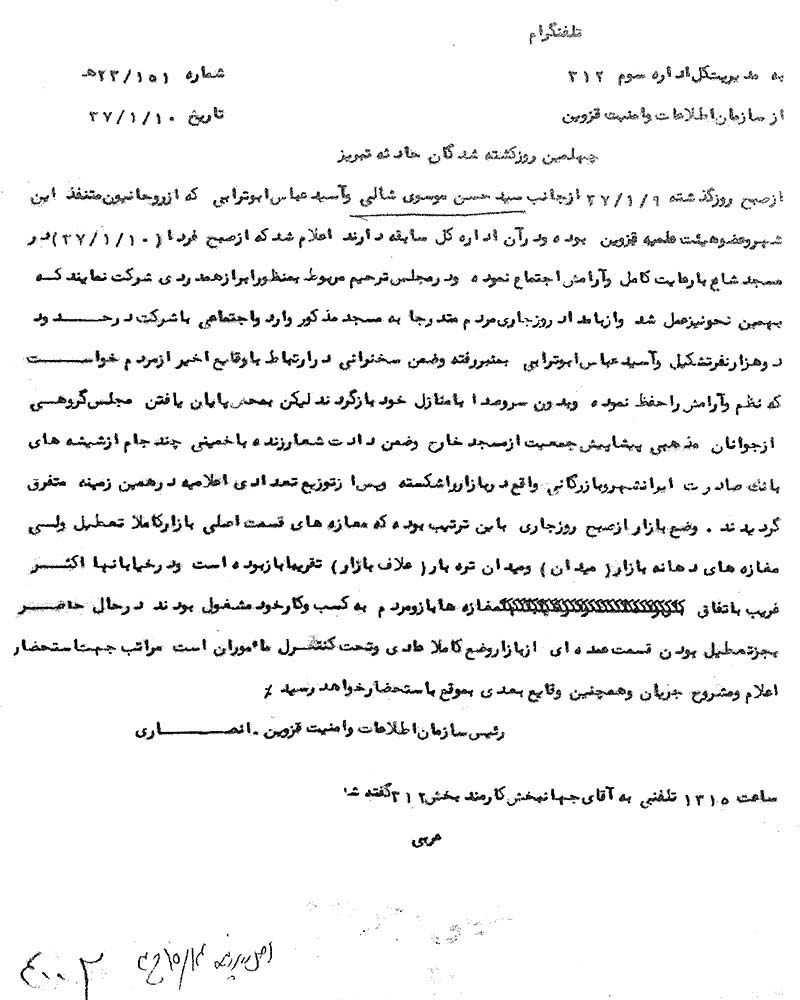 سلسله چهلمها (اربعینها) شهدای انقلاب که از بهمن 1356 شروع شد، چنان شتابی به روند رویدادهای انقلاب اسلامی بخشید که رژیم و دستگاههای امنیتی و انتظامیاش را ناتوان ساخت و به تسلیم واداشت. نقطه آغاز این رویدادها، انتشار مقاله توهینآمیز احمد رشیدی مطلق در روزنامه اطلاعات بود که با عنوان ایران و استعمار سرخ و سیاه در 17 دی 1356 در این روزنامه منتشر شد. در اعتراض به انتشار این مقاله بود که مردم انقلابی قم در 19 دیماه به تظاهرات علیه رژیم پرداختند؛ تظاهراتی که توسط مأموران رژیم در خون نشانده شد. (19 دی به روایت اسناد ساواک، تهران، مرکز بررسی اسناد تاریخی،1382) در چهلمین روز شهادت جمعی از مردم انقلابی قم، راهپیمایی مردم تبریز در 29 بهمنماه نیز فرجامی خونین یافت. در چنین فضای پر از خون و شهادت طلبی مراسم عید نوروز از سوی انقلابیون تحریم شد. انقلابیون تصمیم گرفتند در چهلمین روز شهادت جمعی از مردم تبریز، این بار سلسله اربعینات را تداوم بخشند. این مراسم و مجالس چهلم در شهرهای مختلفی چون یزد، جهرم، ساری، بوشهر و … برگزار شد. (نک: انقلاب اسلامی به روایت اسناد ساواک، کتاب چهارم، تهران، مرکز بررسی اسناد تاریخی، 1378، صفحه120-132) سند زیر از کتاب مساجد استان قزوین انتخاب شده است (پایگاههای انقلاب اسلامی به روایت اسناد ساواک: مساجد، کتاب پنجم: مساجد استان قزوین، تهران، مرکز بررسی اسناد تاریخی، 1395، صفحه283) و برگزاری مراسم چهلمین روز شهادت جمعی از مردم تبریز در مسجد شاه قزوین را روایت کرده است. این مراسم با برنامهریزی و اجرای روحانیون سرشناس شهر قزوین برگزار شد. پایان این مراسم با اعتراضات و تظاهرات مردمی همراه شد که سند حاضر به توصیف بخشی از آن پرداخته است.