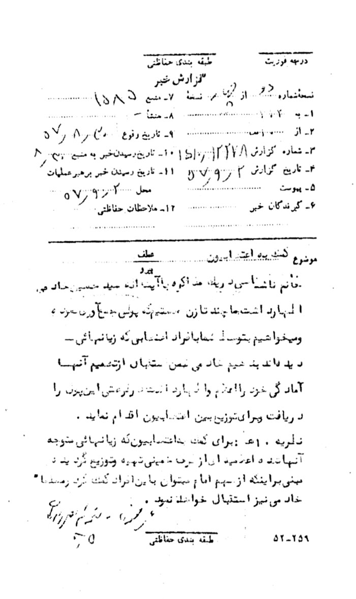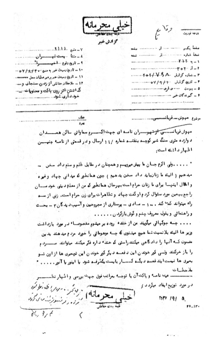 دو سند زیر بخشی از فعالیت زنان مسلمان در جریان انقلاب اسلامی را روایت میکنند. در سندنخست که براساس شنود مکالمات تلفنی تهیه شده است، خانم ناشناسی به آیتالله سید حسین خادمی اعلام میکند که وی به همراه چند زن دیگر پولی را برای کمک به اعتصاب کنندگان جمعآوری کردهاند. وی آیتالله خادمی را به عنوان معتمدی روحانی و انقلابی واسطه قرار داده است تا کمکهای مالی مورد نظر را به اعتصاب کنندگان برساند. موضوع سند دوم فعالیتهای دانشآموزان شهر شاهرود است. همان گونه که در این گزارش آمده است از پنج دانشآموز گرداننده این اعتراضات، سه نفر خانم بودهاند. حضور زنان در فعالیتهای انقلابی به راستی بارز و چشمگیر بود. در نامهای که یک خانم تهرانی برای دوستش در همدان نوشته؛ مسئله حضور زنان در فعالیتهای انقلابی مورد بحث قرار گرفته است. اطلاعات و دیدگاه نویسنده این نامه (نامه مورد کنترل ساواک قرار گرفته) جالب است: «هیچ میشنوی چه موهوماتی را خورد مردم میدهند که آنها [مسئولین بازداشت شده] را دادگاهی میکنند… این دفعه دیگر کورخوندن، این توبمیری از اون تو بمیریها نیست. این دفعه دیگه کار بایست یکطرفه شود یا این ور یا آن ور.» (برای متن این نامه نک: انقلاب اسلامی به روایت اسناد ساواک، تدوین: مرکز بررسی اسناد تاریخی، تهران، 1384، کتاب شانزدهم، ص 476)