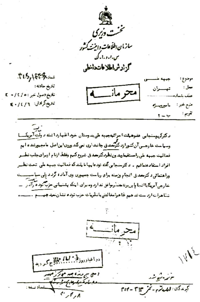 گیرندگان: اداره سوم- بخش 313-314 اصل در پرونده جبهه ملی مرکز ضمیمه و به اداره یکم ارجاع شود. 8 / 4 / 40