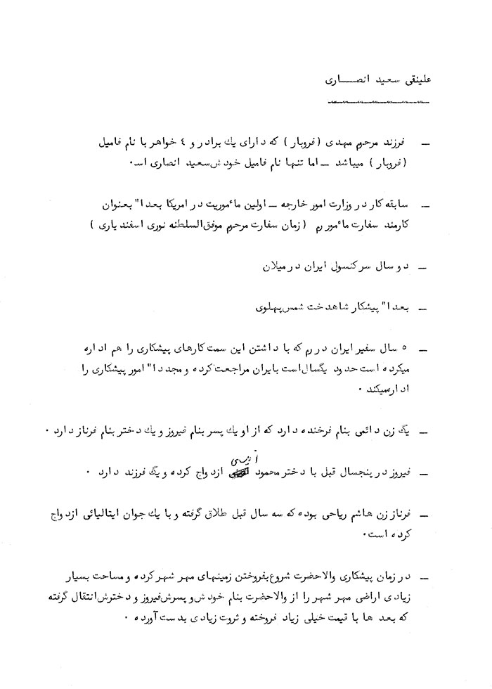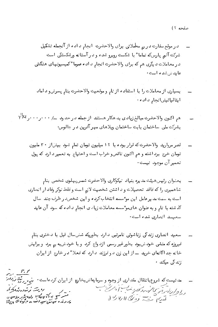 ـ به عنوان رئیس هیئت مدیره بنیاد نیکوکارى والاحضرت شمس پهلوى شخصى به نام شاهمیرى را که فاقد تحصیلات و داشتن شخصیت لازم است و فقط نوکر وفادار انصارى است به سمت مدیرعامل این مؤسسه انتخاب کرده و این شخص در ظرف چند سال گذشته با نام و به عنوانهاى مؤسسه معاملات زیادى انجام داده که سود آن عاید سعید انصارى شده است.