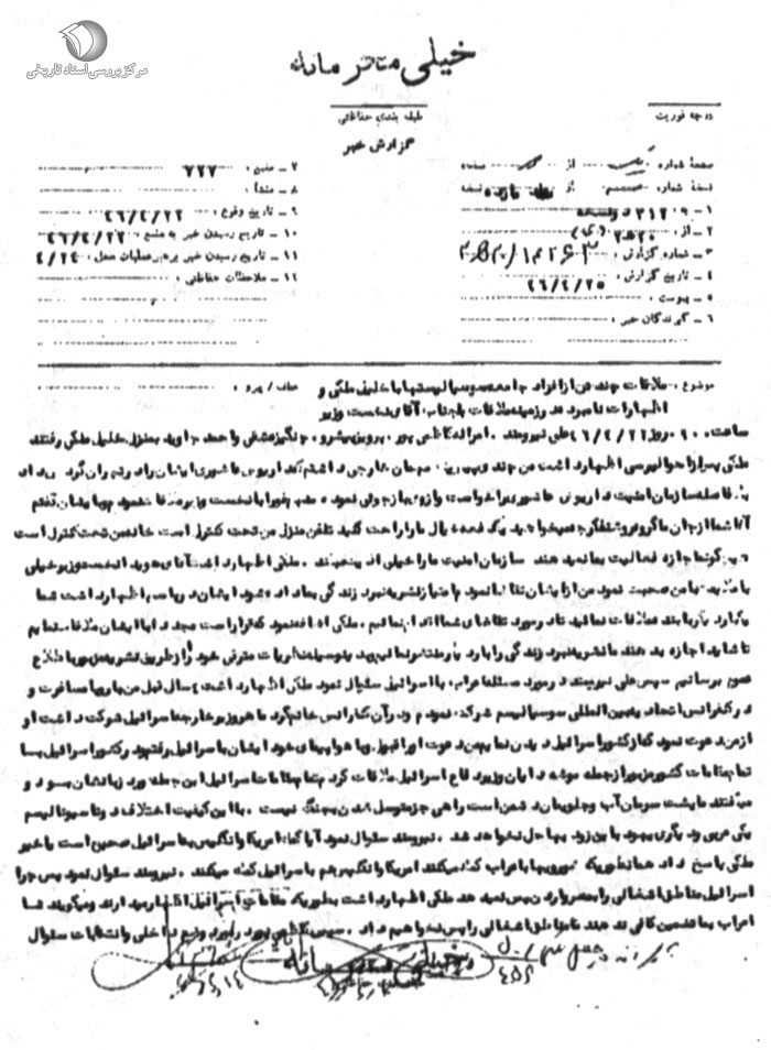 اظهارات ملکی دائر به ملاقات با جناب آقای نخستوزیر مثل همیشه بلوف بوده و صحت ندارد. 26 / 4 / 46
