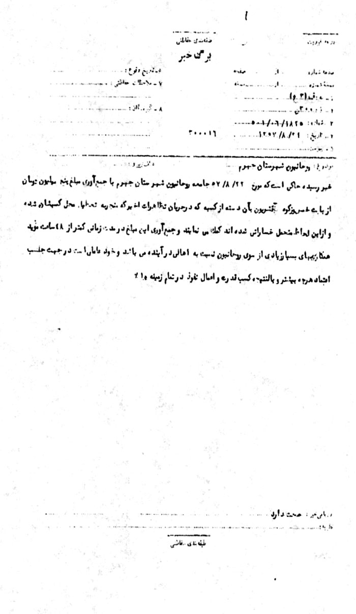 خبر رسیده حاکى است که مورخ 22 / 8 / 57 جامعه روحانیون شهرستان جهرم با جمعآورى مبلغ پنج میلیون تومان از بابت خمس و زکوه قشریون به آن دسته از کسبه که در جریان تظاهرات اخیر که منجر به تعطیل محل کسبشان شده و از این لحاظ متحمل خساراتى شدهاند، کمک مىنمایند و جمعآورى این مبلغ در مدت زمانى کمتر از 48 ساعت مؤید همکاریهاى بسیار زیادى از سوى روحانیون نسبت به اهالى در آینده مىباشد و خود عاملى است در جهت جلب اعتماد هر چه بیشتر و بالنتیجه کسب قدرت و اعمال نفوذ در تمام زمینهها.