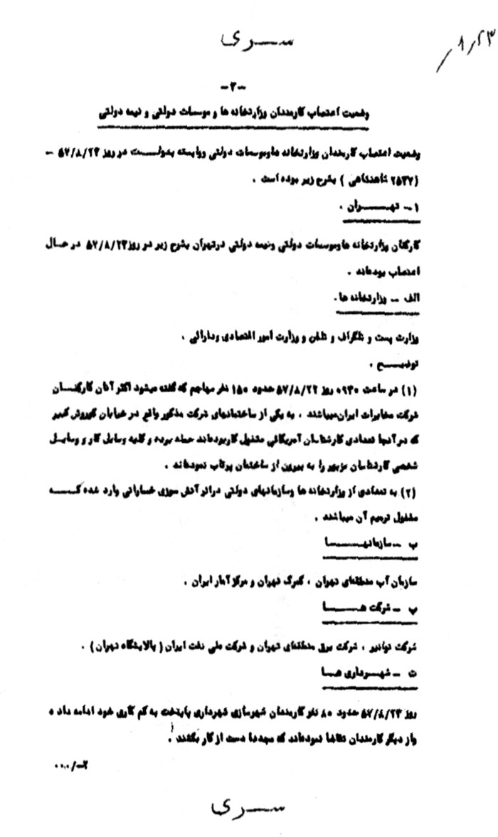 کارکنان وزارتخانهها و مؤسسات دولتى و نیمه دولتى در تهران به شرح زیر در روز 23/ 8/ 57 در حال اعتصاب بودهاند.
