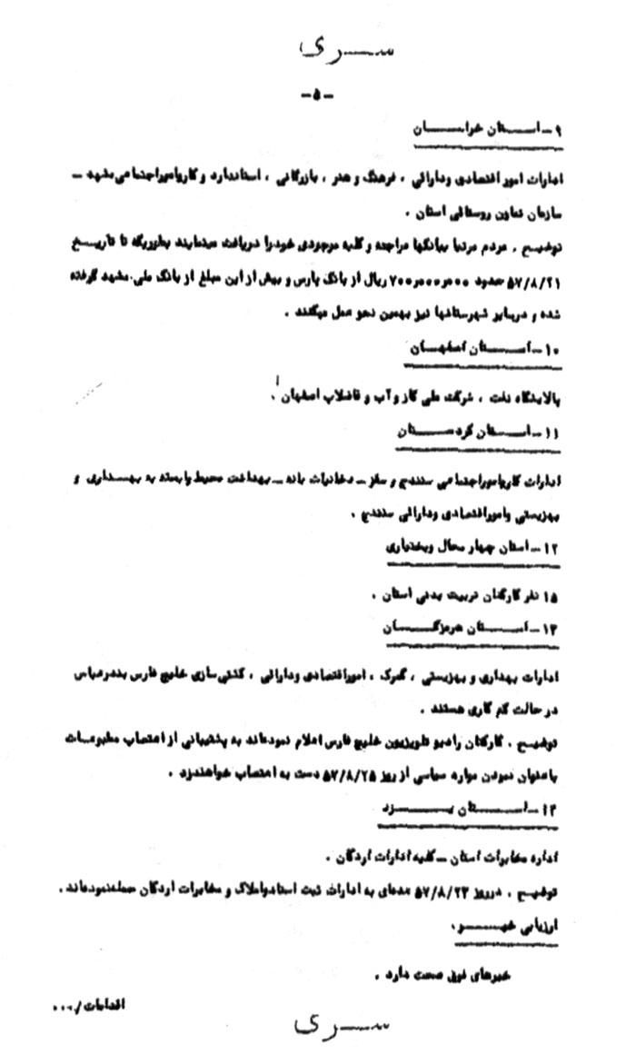 توضیح: مردم مرتباً به بانکها مراجعه و کلیه موجودى خود را دریافت مینمایند به طوری که تا تاریخ 21/ 8/ 57 حدود 000/ 000/ 700 ریال از بانک پارس و بیش از این مبلغ از بانک ملى مشهد گرفته شده و در سایر شهرستانها نیز به همین نحو عمل میکنند.