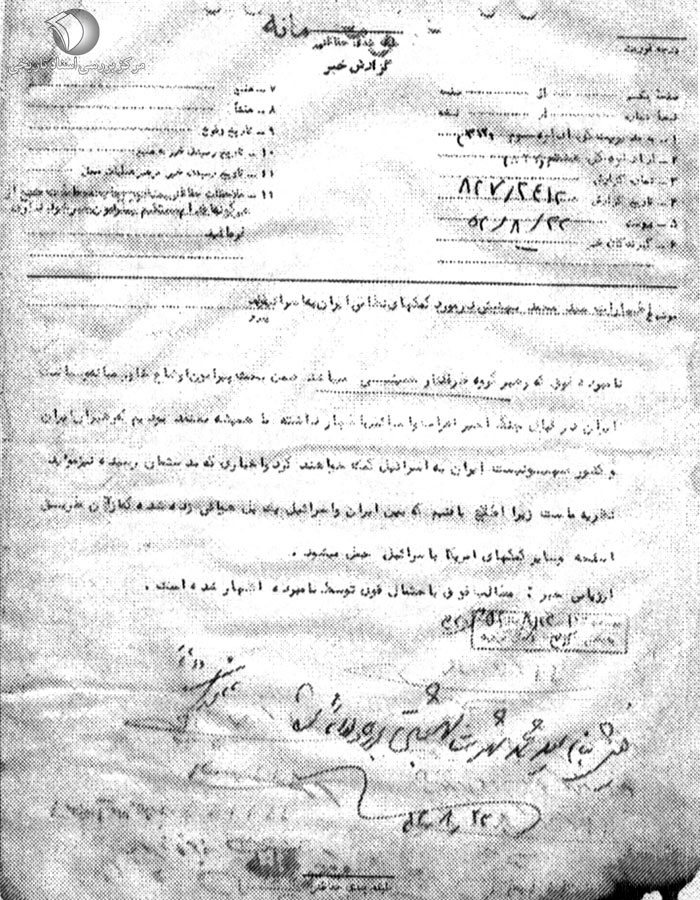 نامبرده فوق که رهبر گروه طرفدار خمینی میباشد ضمن بحث پیرامون اوضاع خاورمیانه و سیاست ایران در قبال جنگ اخیر اعراب و اسرائیل اظهار داشته ما همیشه معتقد بودیم که رهبران ایران و کشور صهیونیست ایران به اسرائیل کمک خواهد کرد و اخباری که به دستمان رسیده نیز مؤید نظریه ماست زیرا اطلاع یافتیم که بین ایران و اسرائیل یک پل هوائی زده شده که از آن طریق اسلحه و سایر کمکهای آمریکا به اسرائیل حمله میشود.