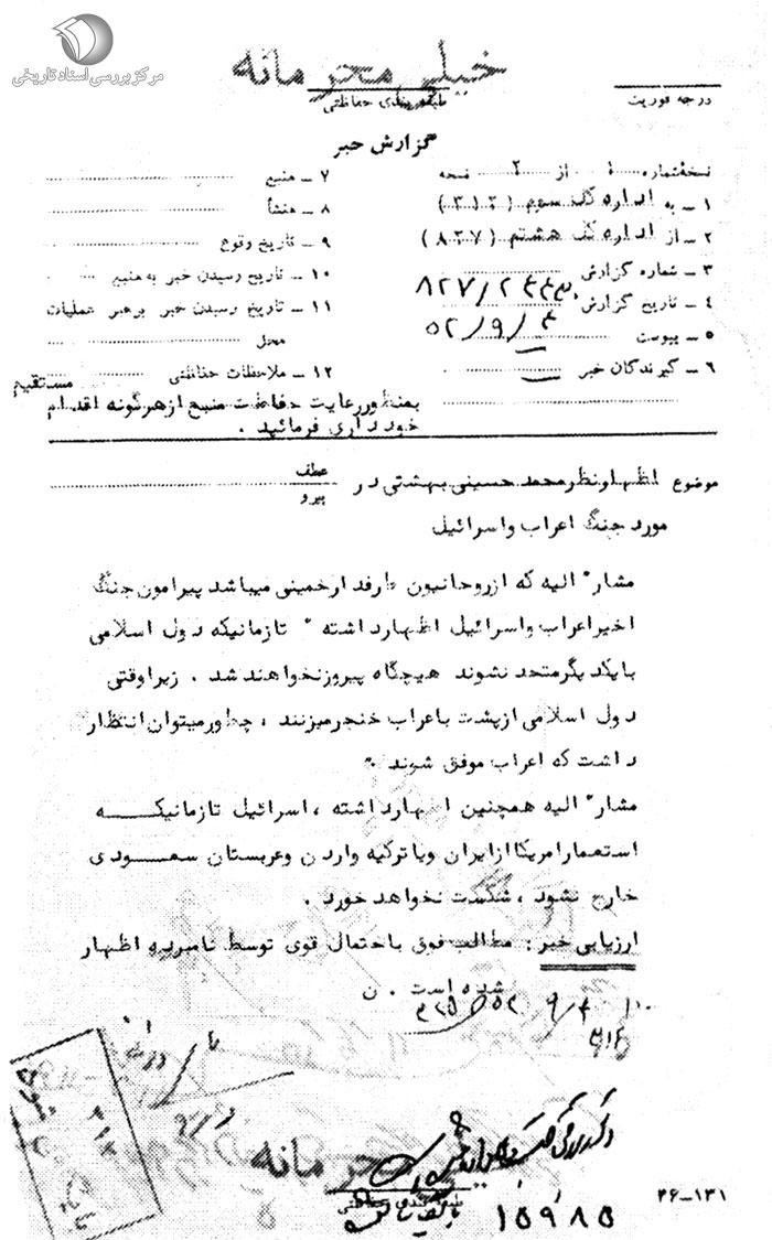 موضوع: اظهارنظر محمد حسینی بهشتی در مورد جنگ اعراب و اسرائیل
