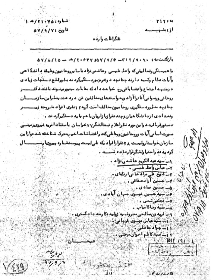 با همبستگی و فعالیتی که واعظ طبسی و هاشمینژاد با سایر روحانیون و طبقه دانشگاهی و آیات عظام و کسبه دارند چنانچه دو نفر مزبور دستگیر گردند به طور قطع دستجات زیادی در مشهد اجتماع و اعتصاباتی رخ خواهد داد که مقامات مجبور میشوند مانند دکتر روحانی و رضوانی آن را آزاد و به خواستههای مخالفین تن در دهند. به نظر این سازمان چنانچه منظور دستگیری روحانیون مخالف است گروه 12 نفری افراد مشروحه زیر و تعدادی از دانشگاهیان و چند نفر از بازاریان با هم باید دستگیر گردند. دستور فرمائید در این مورد نظر اعلام؛ ضمناً لشگر 77 خراسان به استناد امریه نیروی زمینی صورت اسامی آیات و روحانیون و وعاظی که در اغتشاشات اخیر محرک شناخته شده، و از این سازمان خواستار و لیست 28 نفر از افرادی که طی لیست پیوست شماره پیروی ارسال گردیده در اختیار لشگر قرار داده شد.