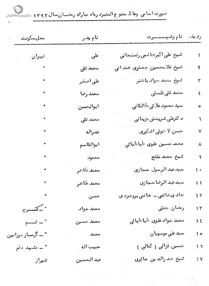 صورت اسامی وعاظ ممنوعالمنبر در ماه مبارک رمضان سال 1393