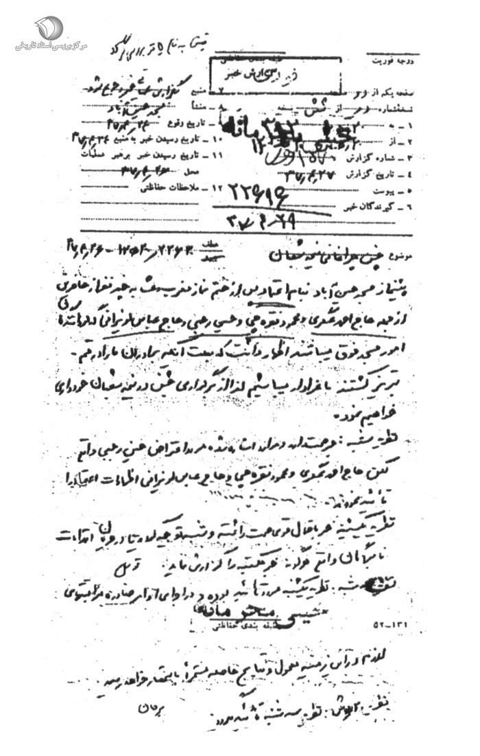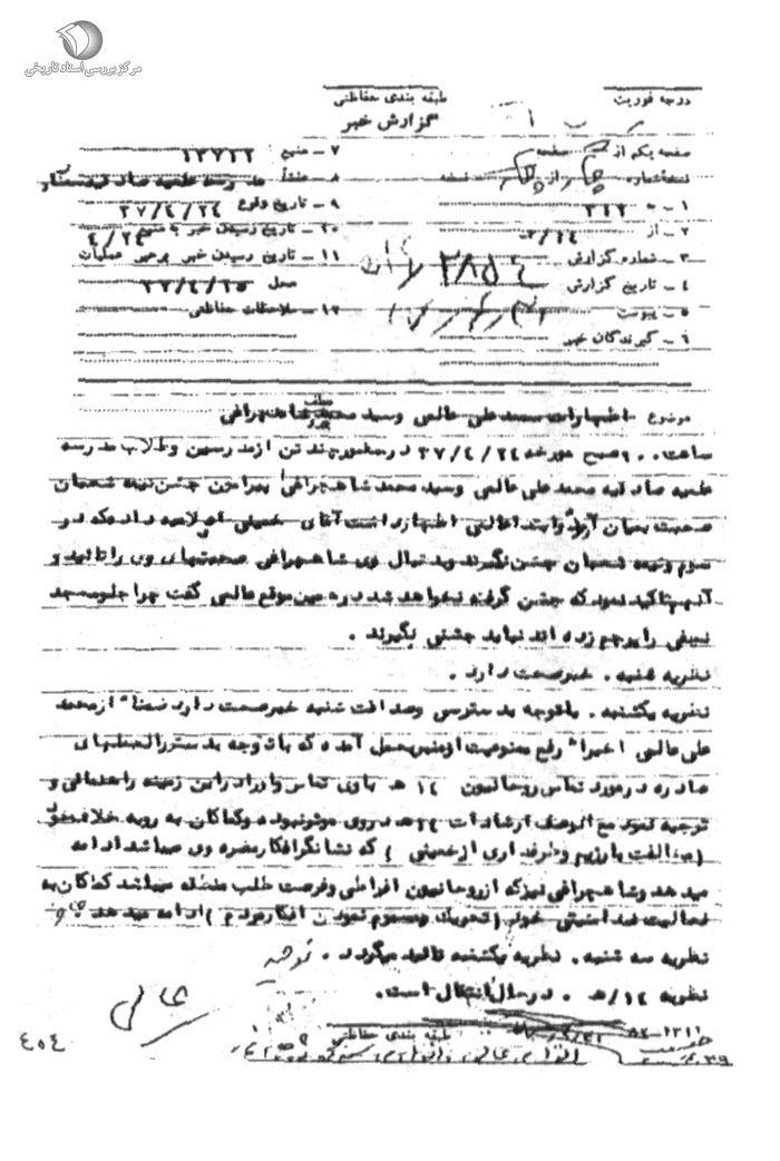 ساعت 900 صبح مورخه 24 / 4 / 37 در حضور چند تن از مدرسین و طلاب مدرسه علمیه صادقیه محمد على عالمى و سید محمد شاهچراغى[1] پیرامون جشن نیمه شعبان صحبت به میان آورده و ابتدا عالمى اظهار داشت: آقاى خمینى اعلامیه داده که در سوم و نیمه شعبان جشن نگیرند و به دنبال وى شاهچراغى صحبتهاى وى را تائید و آن هم تأکید نمود که جشن گرفته نخواهد شد در همین موقع عالمى گفت چرا جلو مسجد نجفى را پرچم زدهاند، نباید جشنى بگیرند.