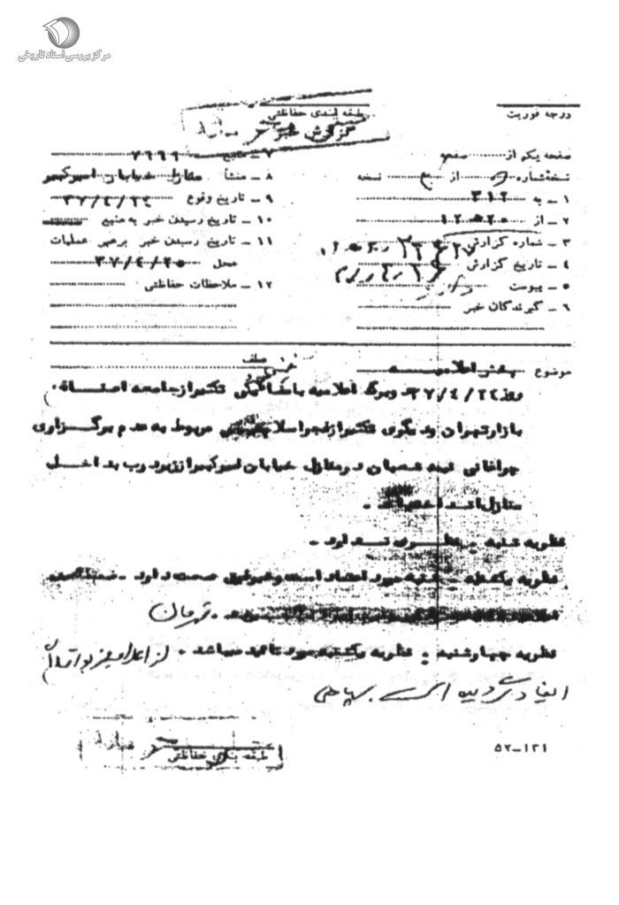 روز 24 / 4 / 37 دو برگ اعلامیه به امضاء خمینى یکى تکثیر از جامعه اصناف بازار تهران و دیگرى تکثیر از فجر اسلام مربوط به عدم برگزارى چراغانى نیمه شعبان در منازل خیابان امیر کبیر از زیر درب به داخل منازل انداختهاند.