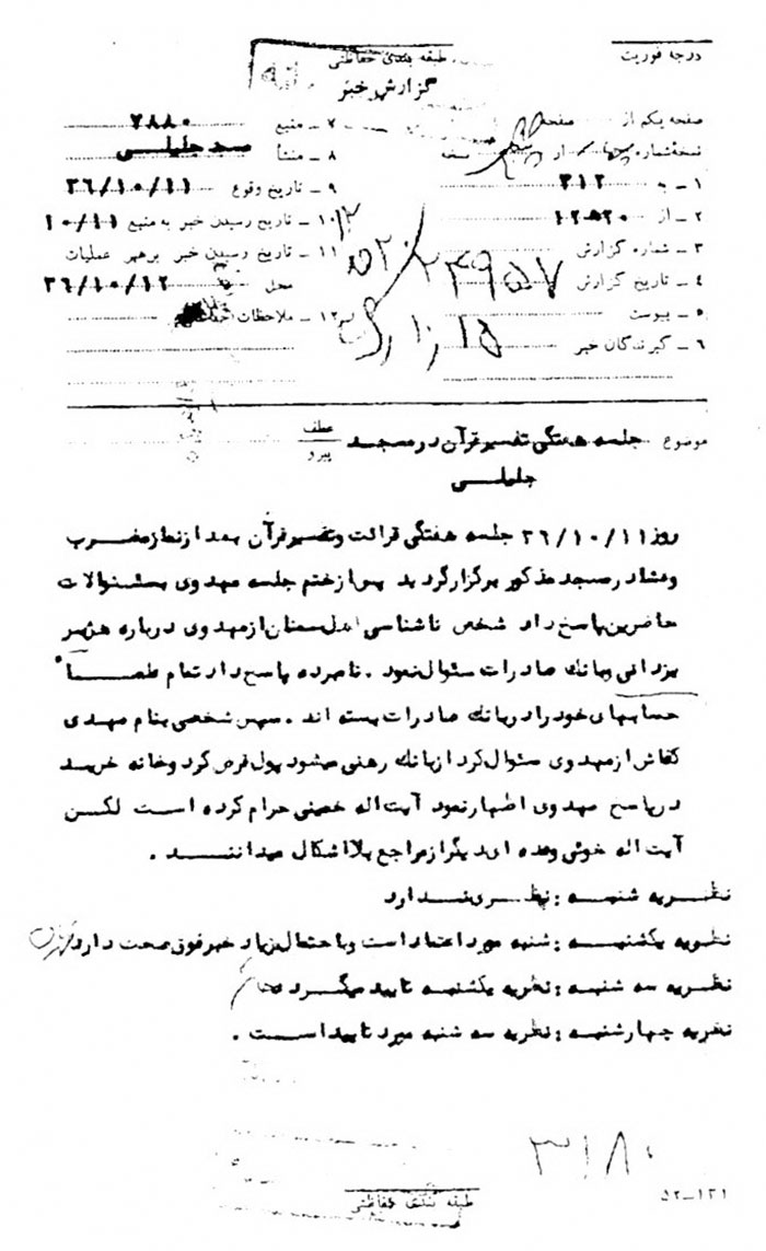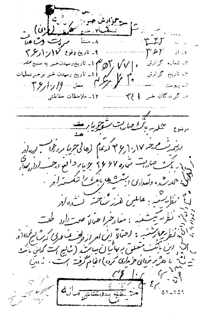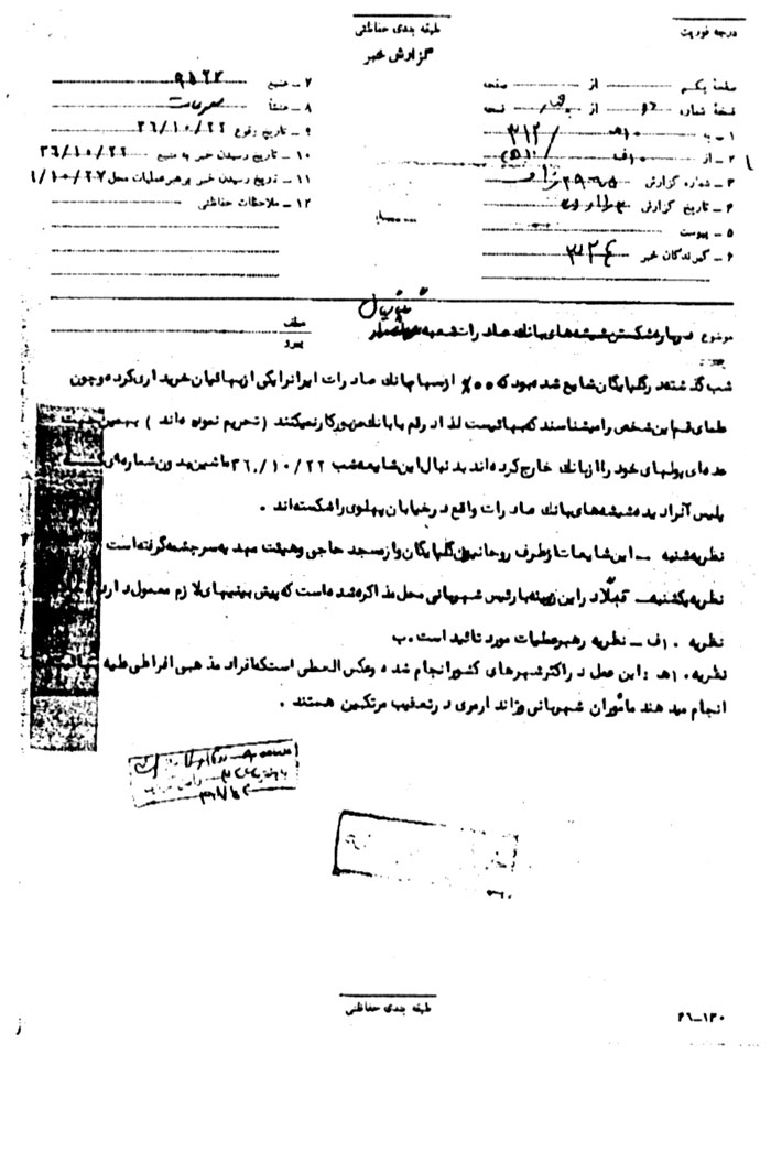 نظریه چهارشنبه: با توجه به اینکه عناصر خرابکار و فرصتطلب از کلیه موقعیتها استفاده مىنمایند اخیراً عدهاى تحت همین پوشش مبادرت به شکستن شیشههاى شعب بانک صادرات در نقاط مختلف اصفهان نموده و اغلب اعلامیههایى به شیشه و دیوار بانک نصب مىنمایند و برابر تحقیقى که به عمل آمده در بین کارکنان بانک نفوذ نموده و با برانگیختن احساسات مذهبى آنان طورى کارکنان بانک را تحت تأثیر قرار مىدهند که عدهاى از آنان تا به حال استعفا دادهاند که ادامه این وضع بىشک خطراتى را دنبال خواهد داشت. لذا وسیله یکشنبه به شنبه آموزش داده شد مراقبتهاى لازم معمول تا افراد محرک را شناسائى و معرفى نماید. قائم