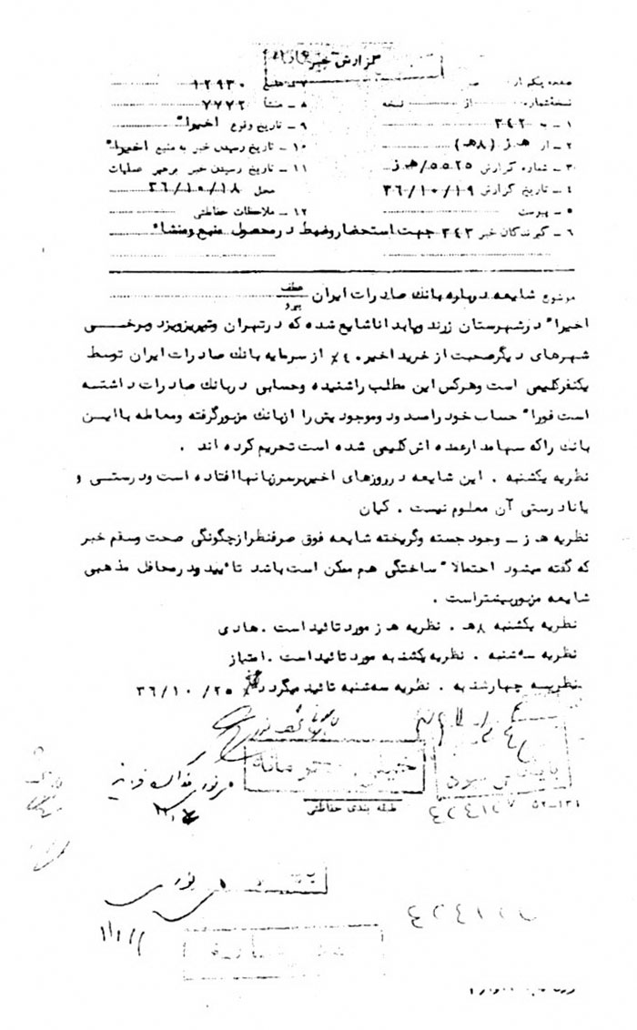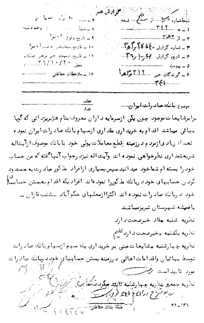 شایعات زیادى در شهر نور و غیره حاکى است هژبر یزدانى که اهل سنگسر و بهائى است تعدادى از سهام بانک صادرات را خریده و بدین جهت علماء قم فتوا دادهاند که با بانک مزبور معامله نشود و حتى عدهاى فقط از نظر تعصب مذهبى به بانک مراجعه حساب خود را برداشت یا قصد بستن حساب و برداشت موجودى را دارند. به هر حال این شایعات به صورتى درآمده است که روز بروز شدت یافته و مسلماً اثر نامطلوبى درباره اقتصاد بانک مزبور خواهد داشت.