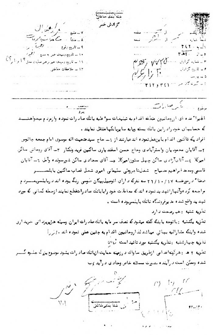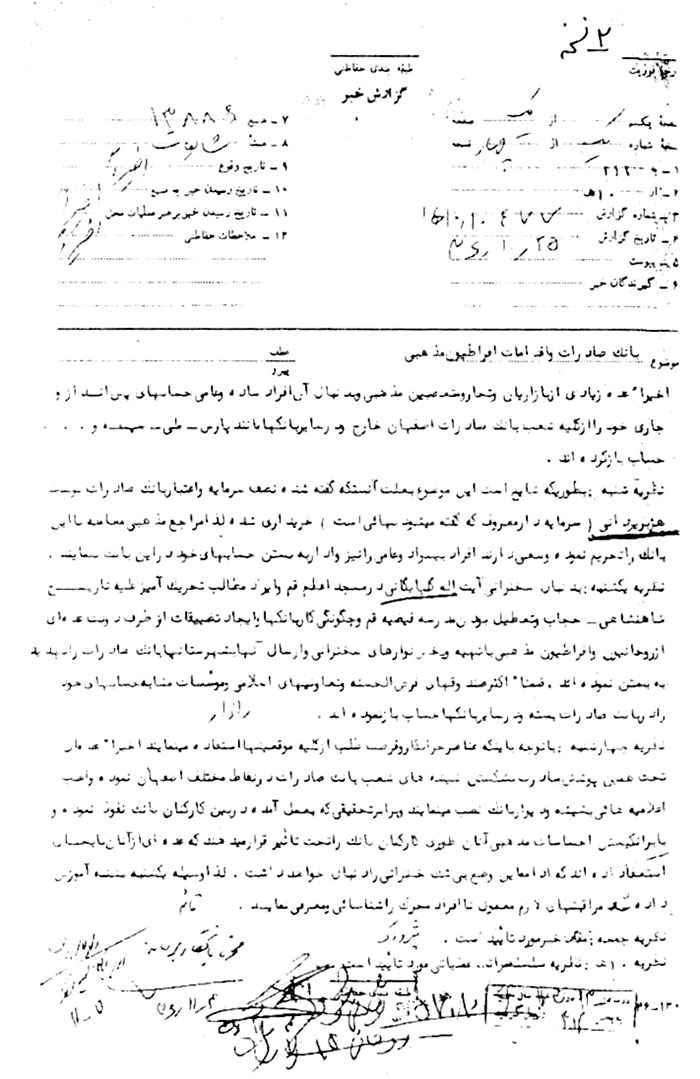 اخیراً عده زیادى از بازاریان و تجار و متعصبین مذهبى و به دنبال آن افراد ساده و عامى حسابهاى پسانداز و جارى خود را از کلیه شعب بانک صادرات اصفهان خارج و در سایر بانکها مانند پارس ـ ملى ـ سپه و... حساب باز کردهاند.