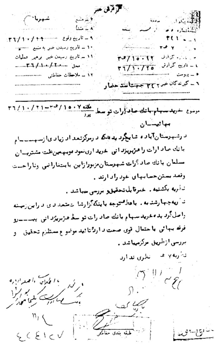 شب گذشته در گلپایگان شایع شده بود که 55% از سهام بانک ایران را یکی از بهائیان خریداری کرده و چون علمای قم این شخص را میشناسند که بهائیست لذا در قم با بانک مزبور کار نمیکنند (تحریم نمودهاند) به همین جهت عدهای پولهای خود را از بانک خارج کردهاند. به دنبال این شایعه شب 22 / 10 / 36 ماشین بدون شمارهای که پلیس آن را دیده شیشههای بانک صادرات واقع در خیابان پهلوی را شکستهاند.