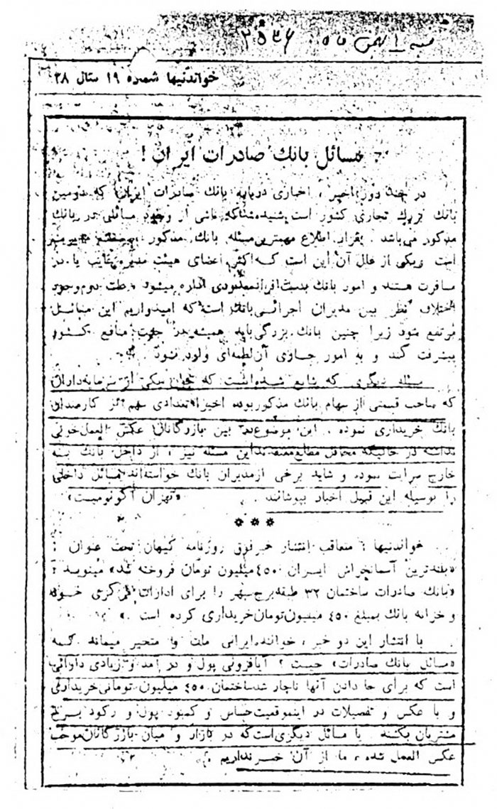 با انتشار این دو خبر، خواننده ایران مات و متحیر مىماند که «مسائل بانک صادرات» چیست؟ آیا فزونى پول و درآمد و زیادى دارائى است که براى جا دادن آنها ناچار شد ساختمان 450 میلیون تومانى خریدارى و با عکس و تفصیلات در این موقعیت حساس و کمبود پول و رکود به رخ مشتریان بکشند. یا مسائل دیگرى است که در بازار و میان بازرگانان موجب عکسالعمل شده، ما از آن خبر نداریم.