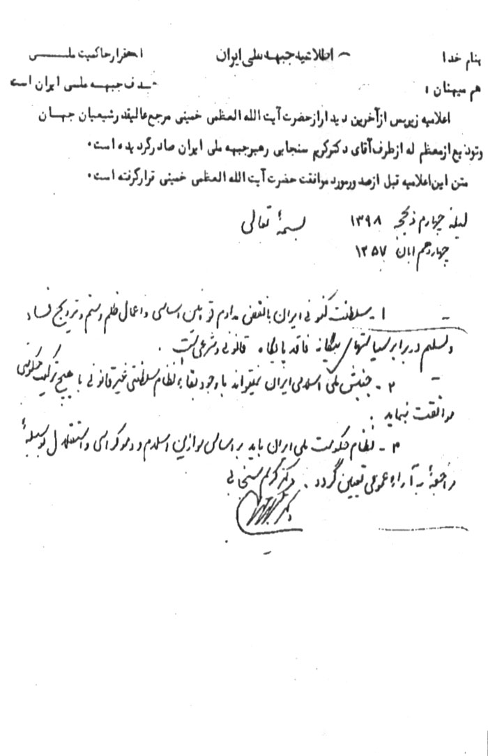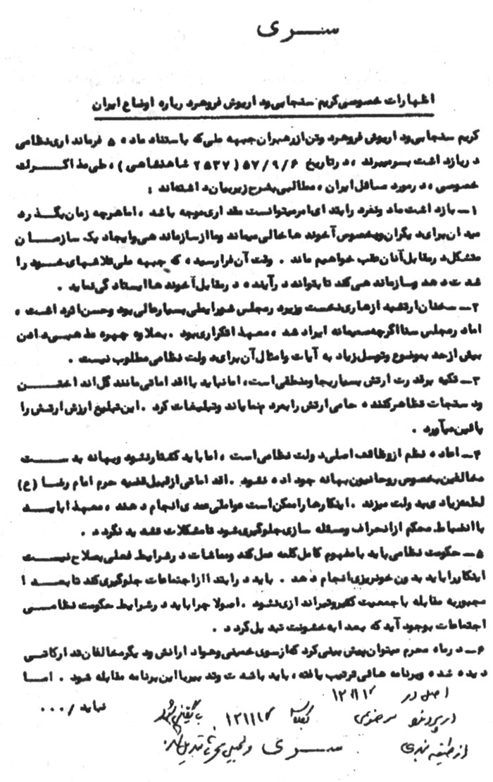 اوایل آبان 1357 دکتر سنجابی رئیس هیأت اجرایی جبهه ملی، برای شرکت در کنفرانس بینالمللی سوسیالیستها راهی کانادا شد. هدف سفر به سرانجام نرسید و سنجابی سر راه خود به پاریس رفت. نتیجه اقامت کوتاه در پاریس و ملاقاتش با رهبر انقلاب اسلامی حضرت امام خمینی (ره) به صدور اعلامیه سه مادهای انجامید که به پیوستن ملیون به جناح مذهبی انقلاب و پذیرش آیتالله خمینی تصریح داشت. در همین زمان سایر رهبران جبهه ملی با توجه به خواست رژیم برای سازش با ملیون خواهان به دست گرفتن نخستوزیری سنجابی بودند. به دنبال بازگشت سنجابی از پاریس و قبل از مصاحبه وی و تشریح مواضع جبهه ملی، فروهر و سنجابی توسط مأمورین حکومت نظامی بازداشت شدند و حدود یک ماه در ویلایی در شمال شهر تحت نظر به سر میبردند. این امر در راستای بزرگنمایی نقش و موقعیت آنها در برابر رهبری مذهبی انقلاب بود در طول این مدت مذاکراتی میان نامبردگان با ریاست ساواک صورت گرفت و شخص سنجابی با شاه نیز دیدار خصوصی داشت که در آن جلسه شاه به وی پیشنهاد نخستوزیری داد. سنجابی با توجه به شرایط موجود نتوانست این پیشنهاد را بپذیرد اما فردی دیگر از رهبران جبهه ملی یعنی شاپور بختیار این پیشنهاد را قبول کرد. از مفاد این گفتگوها میتوان به کُنه واقعی آنها و اصولاً دیدگاههای جبههی ملی راجع به روحانیت و انقلاب پی برد. در کنار توصیههای آنها در مورد نحوهی برخورد دولت و ارتش با تظاهرات، آنچه که جلب نظر میکند مکنونات واقعی این افراد است. در قسمتی از این اظهارات آمده است: