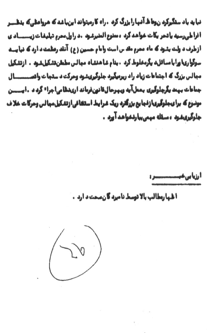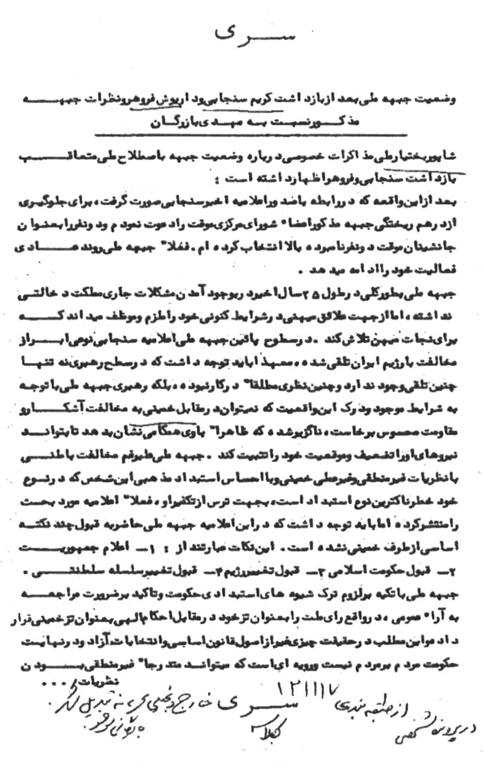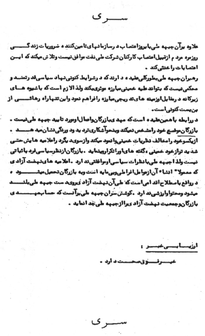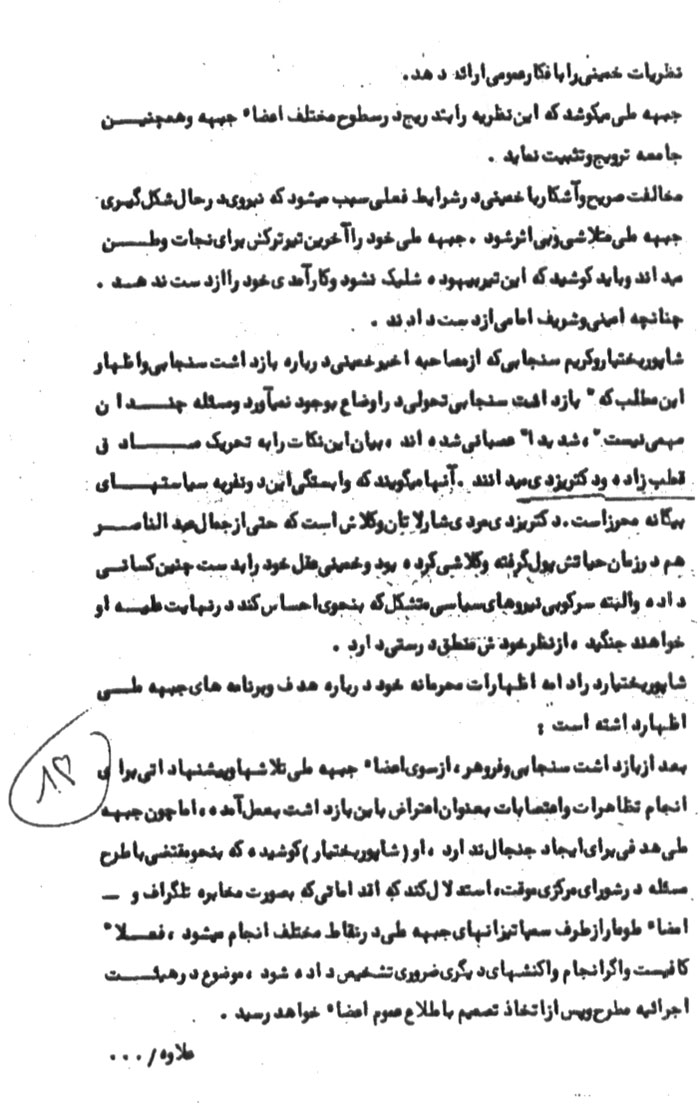 «بازداشت ما دو نفر در ابتدای امر میتوانست مقداری موجه باشد، اما هرچه زمان بگذرد میدان برای دیگران و به خصوص آخوندها خالی میماند و ما از سازماندهی و ایجاد یک سازمان متشکل در مقابل آنان عقب خواهیم ماند. وقت آن فرا رسیده که جبههی ملی تلاشهای خود را شدت دهد تا بتواند در آینده در مقابل آخوندها ایستادگی نماید.»