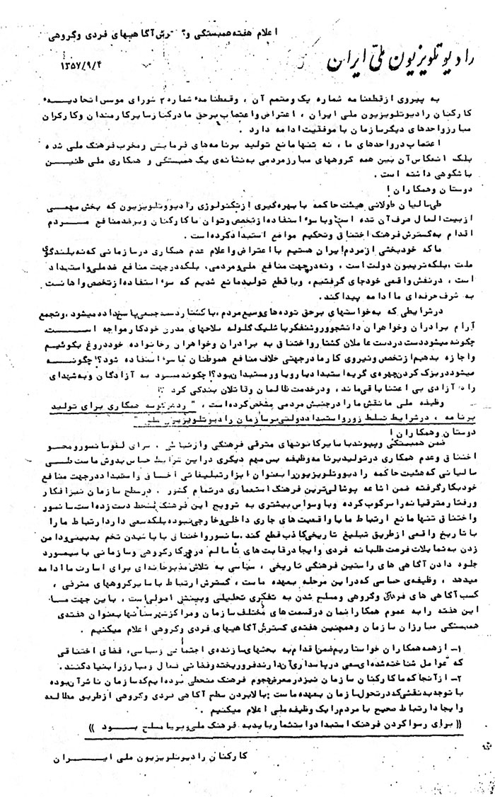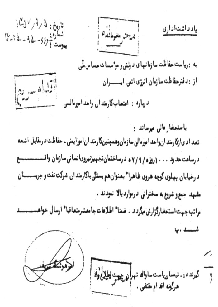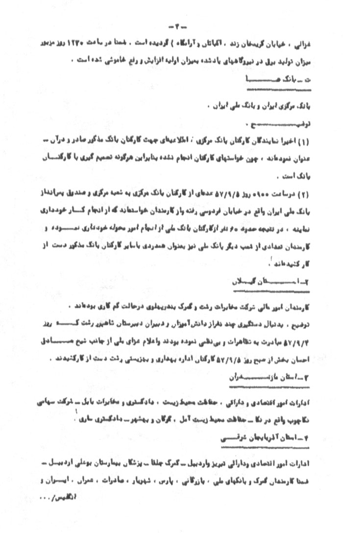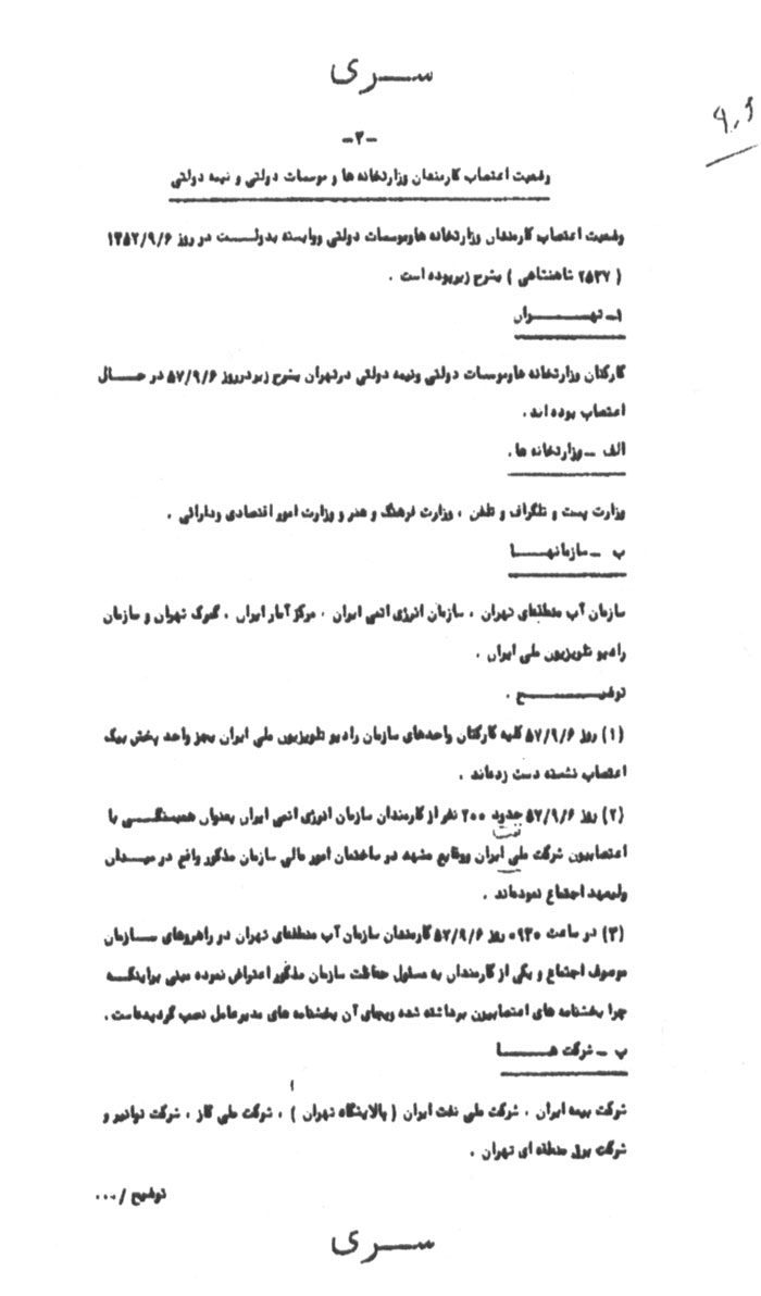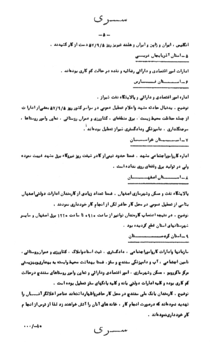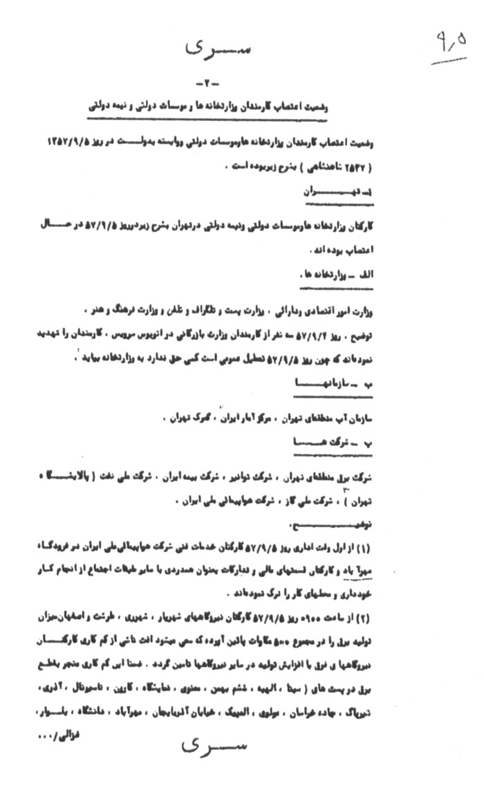 برای این که تصویری دقیق از این اعتصابات در ذهن شما ترسیم شود اسناد و اخبار مربوط به گزارش اعتصاب کارکنان تأسیسات نفتی ری و گزارش مربوط به اعتصاب کارکنان گمرکات و رادیو و تلویزیون و مشکلات ناشی از آن را مطالعه فرمائید.
