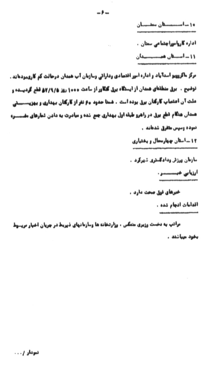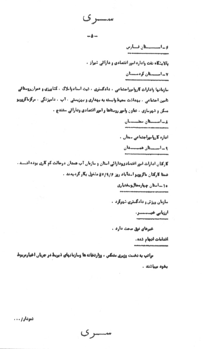 * کارکنان اداره آمار امروز(5 / 9 / 57) در طبقه ششم گردهم آمدند و با پایین آوردن عکس شاه و سخنرانى از همکاران خود خواستند که تا روز سهشنبه بر سر کار حاضر نشوند. ساواک عامل این اقدامات را تلاش دو تن از کارکنان این اداره مىدید :آقایان موسوى و غفارمنش.