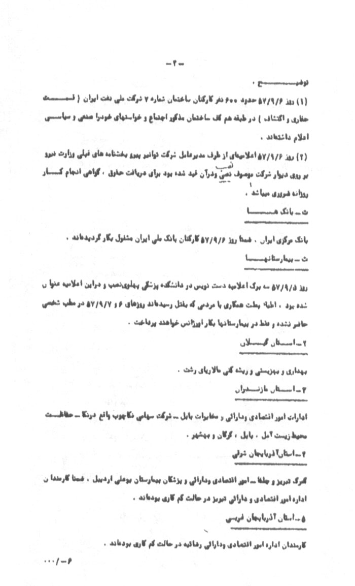* از دیگر اعتصابیون در امروز (6 / 9 / 57) تهران، کارمندان دانشگاه آزاد، کارمندان شهردارى پایتخت، کارگران قند و شکر تهران، کارکنان سازمان برنامه، کارگران کارخانه استارلایت، کارگران کارخانه چیت ممتاز بودند.