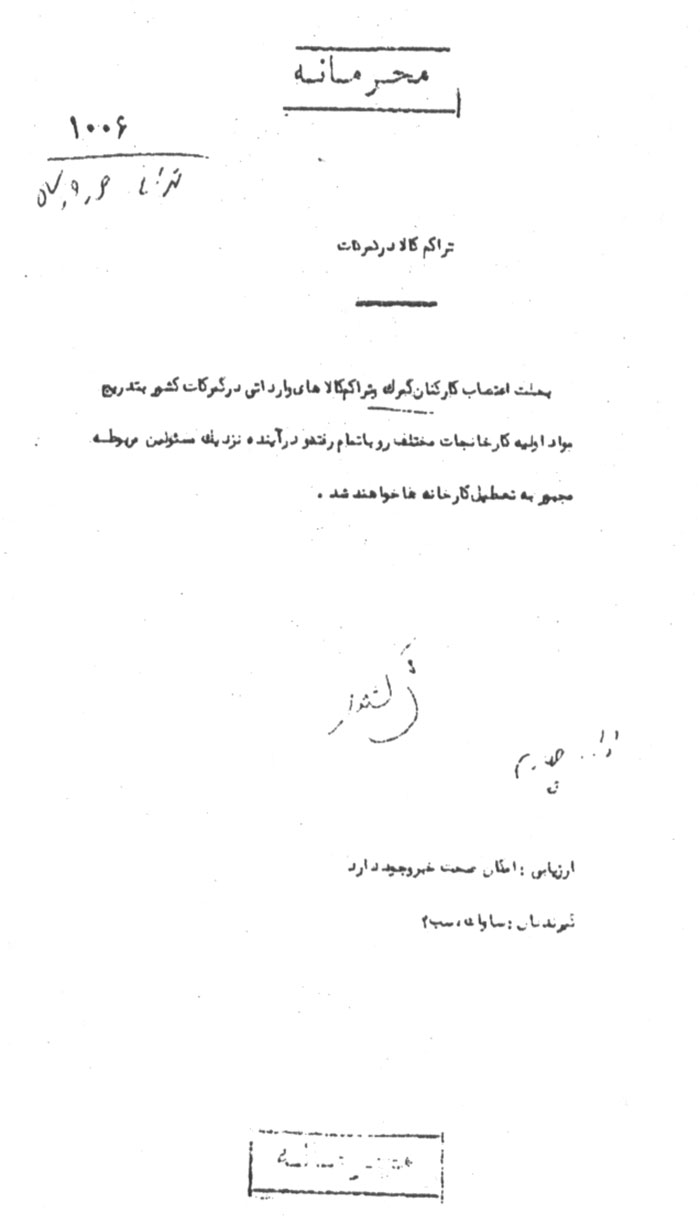 * کارخانه ایران ترانسفو که 600 کارگر داشت از صبح امروز (5 / 9 / 57) به مناسبت اعلام عزاى عمومى دست از کار کشیدند. (73853 ـ 20 ﻫ23 ـ 5 / 9 / 57)