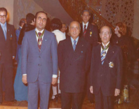 دریافت نشانهای درباری توسط سرسپردگان رژیم پهلوی. در تصویر از چپ به راست: پرویز ثابتی ونعمت ا... نصیری از مقامات بلندپایه ساواک مشاهده می شوند.