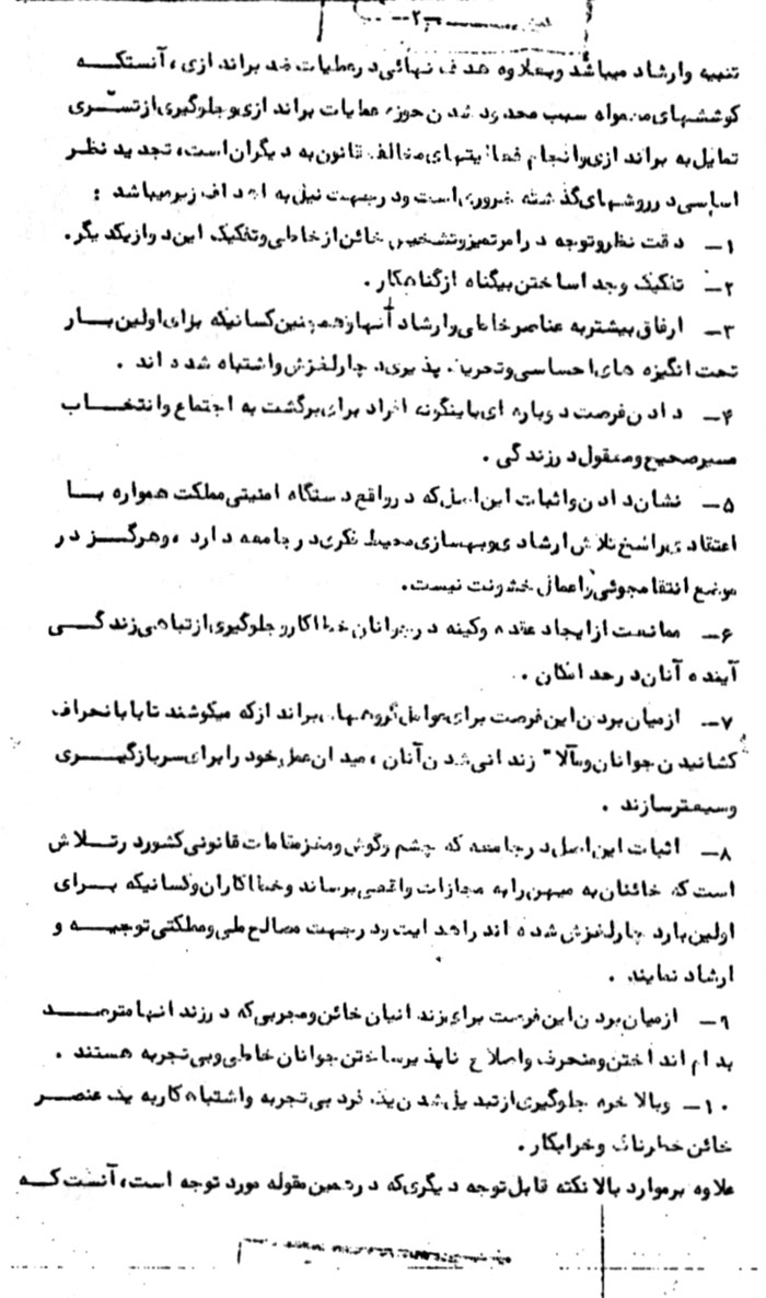 علاوه بر موارد بالا نکته قابل توجه دیگری که در همین مقوله مورد توجه است، آن است که به هنگام شروع تظاهرات اخلالگرانه در محیطها و اماکن مختلف، تا موقع حضور مأمورین انتظامی، افراد مؤثر و اخلالگران واقعی از محل میگریزند و معمولاً کسانی میمانند که یا خود را واقعاً بیگناه میدانند و دلیلی برای گریختن نمیبینند و یا تصادفاً از محل عبور میکردهاند و یا فقط صرفاً تماشاچی بودهاند. در این موقع مأمورین عدهای را دستگیر میکنند و آنها را به ساواک تحویل میدهند. در این گونه موارد هم فرصت برای رسیدگی دقیق به وضع فرد فرد دستگیرشدگان مستلزم صرف وقت بسیار و در نهایت ناراحت کردن افراد دستیگر شده میباشد و طبعاً مغایر با اصل فلسفی اشاره شده در بالا خواهد بود. حتی چنانچه در این میان افرادی باشند که برای اولین بار در فعالیتهای ناهنجار و ضد امنیتی دستی داشته باشند، بازهم تا اثبات مطلق خائن بودن آنان، به دلیل عدم وجود مدارک کافی در چنین شرایطی، نتیجه مطلوب عاید نخواهد گردید. علیهذا برای رسیدن به هدفهای اشاره شده در فوق و اینکه از تفویض فرصتهای ارشادی و اصلاحکننده دریغ نشده باشد و نیت اصلی در امر هدایت منطقی بزهکاران تأمین گردد، روش کار تنظیم شده به شرح پیوست ابلاغ میگردد. خواهشمند است دستور فرمایید مسئولین امر را دقیقاً نسبت به موضوع توجیه نموده و ترتیبی اتخاذ نمایند که برای روش اشاره شده در مورد متهمین اقدام و نتایج حاصله را در هر مورد جداگانه به مرکز منعکس سازند.