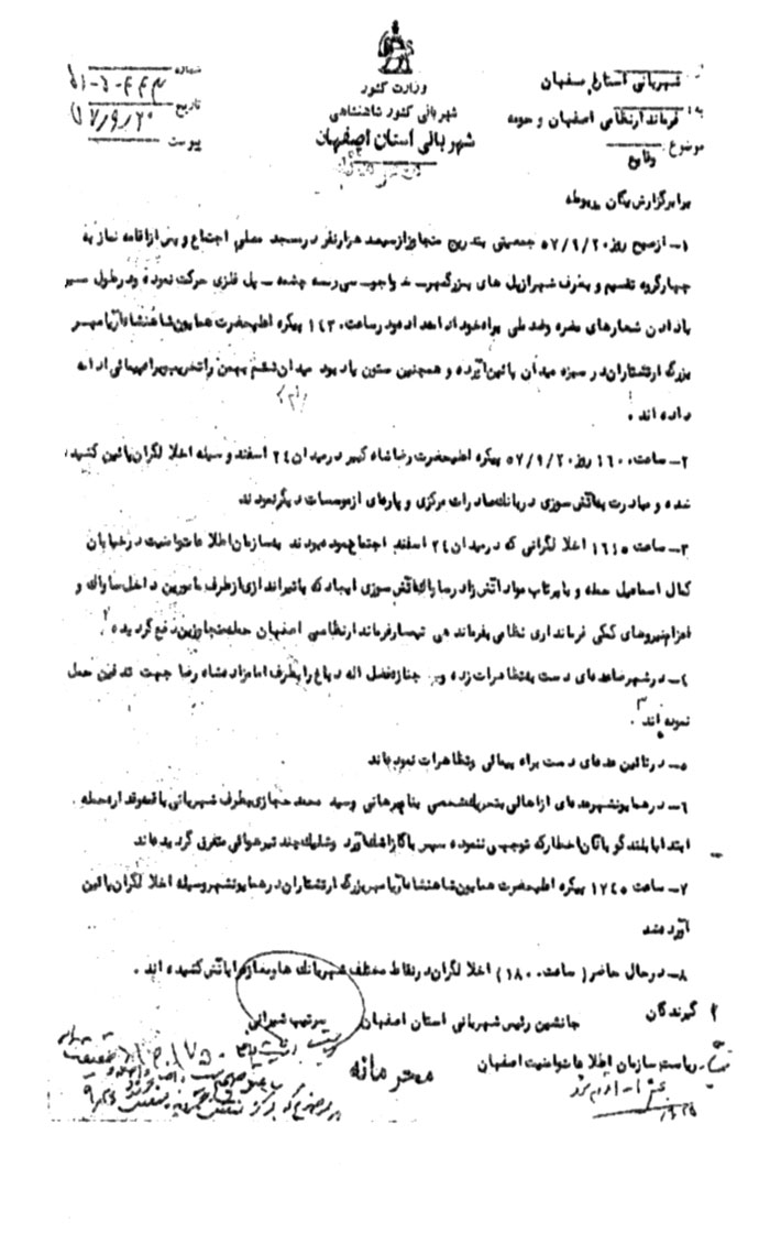 برابر گزارش یگان مربوطه 1ـ از صبح روز 20 / 9 / 57 جمعیتى به تدریج متجاوز از سیصد هزار نفر در مسجد مصلى اجتماع و پس از اقامه نماز به چهار گروه تقسیم و به طرف میدان شهر از پلهاى بزرگمهر ـ خواجو ـ سى و سه چشمه ـ پل فلزى حرکت نموده و در طول مسیر با دادن شعارهاى مضره و ضد ملى به راه خود ادامه داده و در ساعت 1430 پیکره اعلیحضرت همایون شاهنشاه آریامهر بزرگ ارتشتاران در سبزه میدان پائین آورده و همچنین ستون یاد بود میدان ششم بهمن را تخریب و به راهپیمائى ادامه دادهاند.[1]