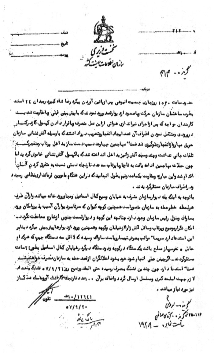 با توجه به اینکه یک دیوار سازمان مشرف به خیابان وسیع کمال اسماعیل و مجاور رودخانه مىباشد و از آن طرف هر لحظه خطر حمله به سازمان متصور است همچنین کوچه کیوان که سرتاسر دیوار آن آسیبپذیر و امکان ورود به ساواک و منزل رئیس سازمان وجود دارد چنانچه این کوچه و دیوار قسمت جنوبى از خارج محافظت نگردد امکان تکرار موضوع و پرتاب وسائل آتشزا را از خیابان و کوچه و همچنین ورود از دیوارها پیشبینى مىگردد بنابر این استدعا دارد سریعاً مراتب به عرض تیمسار ریاست ساواک رسیده که لااقل سه دستگاه جیپ که هر کدام حامل 5 نفرسرباز مسلح باشد یک دستگاه در کوچه و دو دستگاه دیگر در خیابان کمال اسماعیل به طور 24 ساعت مستقر گردند ـ اگر چنین عملى انجام شود خود به خود اخلالگران از قصد به حمله به سازمان منصرف خواهند شد ضمناً استدعا دارد چون چندین فشنگ به مصرف رسیده حتىالمقدور صبح روز 21 / 9 / 57 فشنگ به تعداد لازم جهت اسلحه کمرى و مسلسل ارسال گردد و اضافه بر آن 100 عدد نارنجک گاز اشکآور و ماسک ضد گاز نیز مورد نیاز مىباشد.[4]