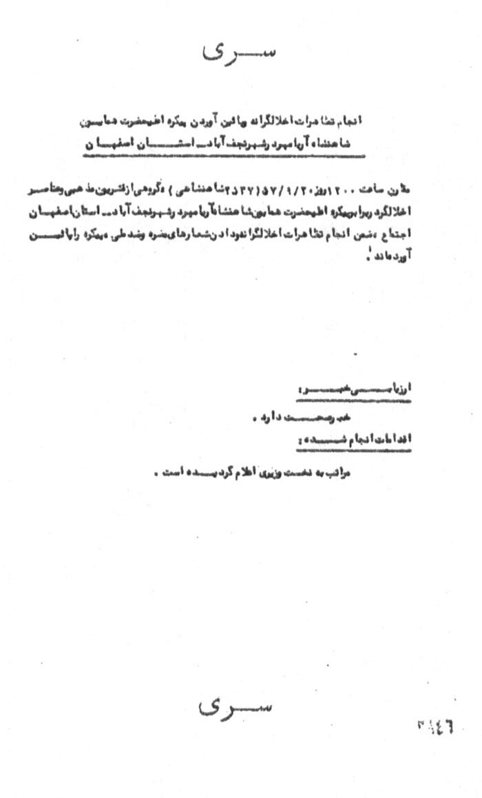 مقارن ساعت 1200 روز 20 / 9 / 57 (2537 شاهنشاهى)، گروهى از قشریون مذهبى و عناصر اخلالگر در برابر پیکره اعلیحضرت همایون شاهنشاه آریامهر درشهر نجفآباد ـ استان اصفهان اجتماع، ضمن انجام تظاهرات اخلالگرانه و دادن شعارهاى مضره و ضد ملى، پیکره را پائین آوردهاند.[5]