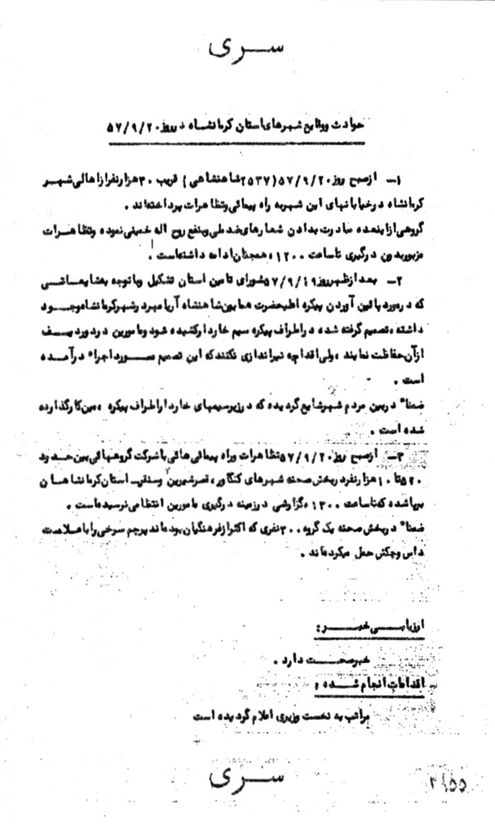 3ـ از صبح روز 20 / 9 / 57 تظاهرات و راهپیمائى با شرکت گروههاى بین حدود 5 تا 10 هزار نفر در بخش صحنه شهرهاى کنگاور، قصر شیرین[7] و سنقر ـ استان کرمانشاهان- بر پا شده که تا ساعت 1300، گزارشى در زمینه درگیرى مأمورین انتظامى نرسیده است.