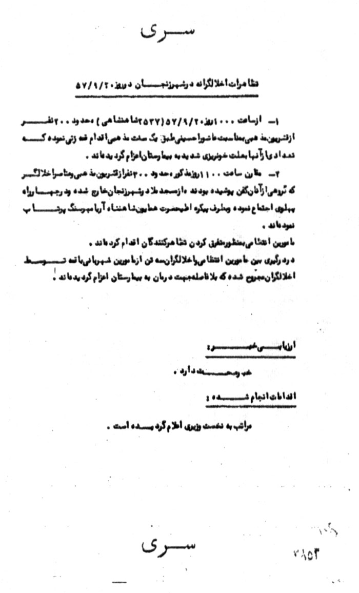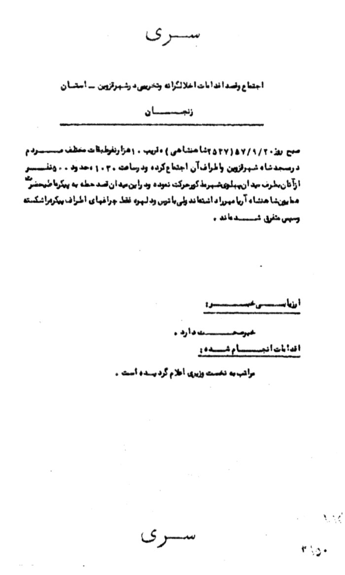2ـ مقارن ساعت 1100 روز مذکور، حدود 300 نفر از قشریون مذهبى و عناصر اخلالگر که گروهى از آنان کفن پوشیده بودند، از مسجد ملا در شهر زنجان خارج شده و در چهارراه پهلوى اجتماع نموده و به طرف پیکره اعلیحضرت همایون شاهنشاه آریامهر سنگ پرتاب نمودهاند.