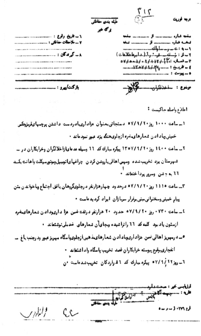 1ـ ساعت 1000 روز 20 / 9 / 57 دستجاتى به عنوان عزادارى با در دست داشتن پرچمهاى قرمز و عکس خمینى و با دادن شعارهاى مضره از جلوى هنگ یزد عبور نمودهاند.