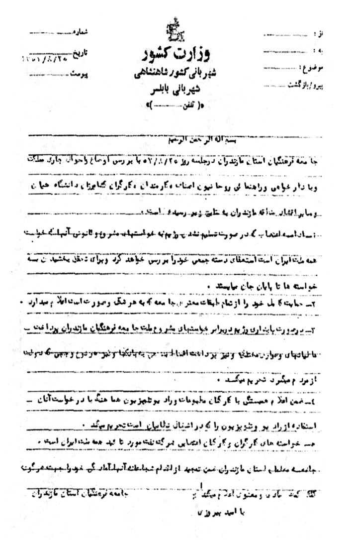 جامعه فرهنگیان استان مازندران در جلسه روز 25 / 8 / 57 با بررسى اوضاع واحوال جارى مملکت و با نظرخواهى و راهنمائى روحانیون، اصناف، کارمندان، کارگران، کشاورزان، دانشگاهیان و سایر اقشار منطقه مازندران به نتایج زیر رسیده است.