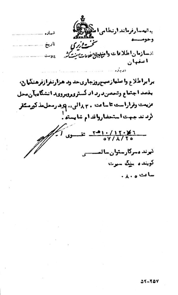 برابر اطلاع واصله از صبح روز جارى حدود هزار نفر از فرهنگیان[اصفهان] به قصد اجتماع و تحصن در دادگسترى روبروى دانشگاه به آن محل عزیمت و قرار است تا ساعت830 الى 0900 در محل مذکور مستقر گردند. جهت استحضار و اقدام شایسته.[2]