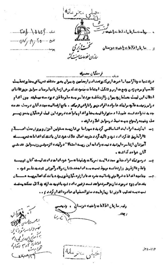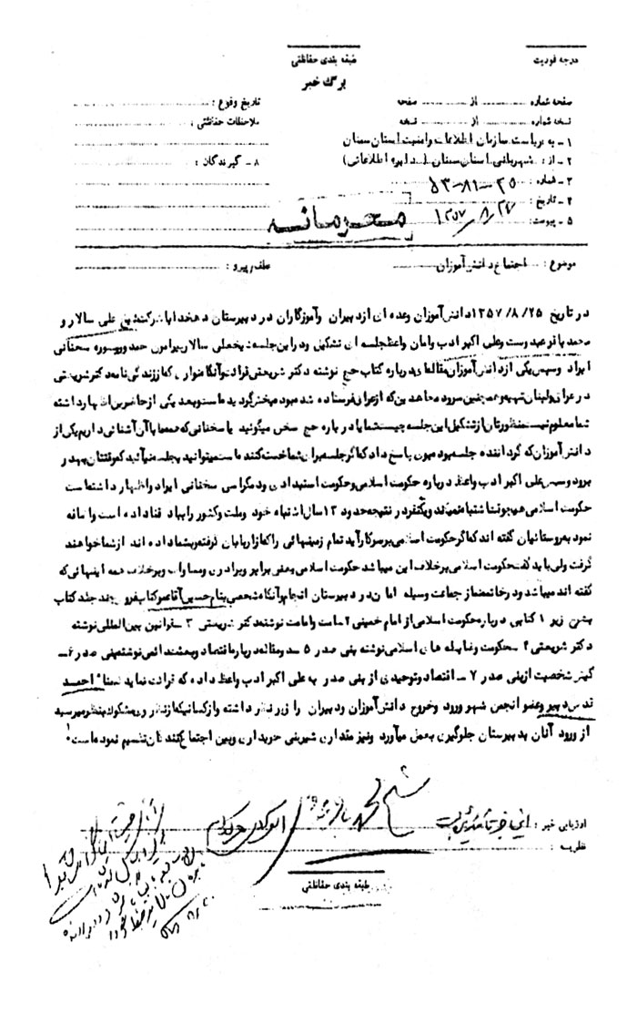 [3] . تاریخ این گزارش امروز(25 / 8 / 57) است، اما اشاره به تاریخ صدور اعلامیه فرهنگیان قم مربوط به بیست و چهارم آبان است. بند دوم هم موقعیت مراکز آموزشى قم و کاشان را در روز جارى نشان مىدهد.